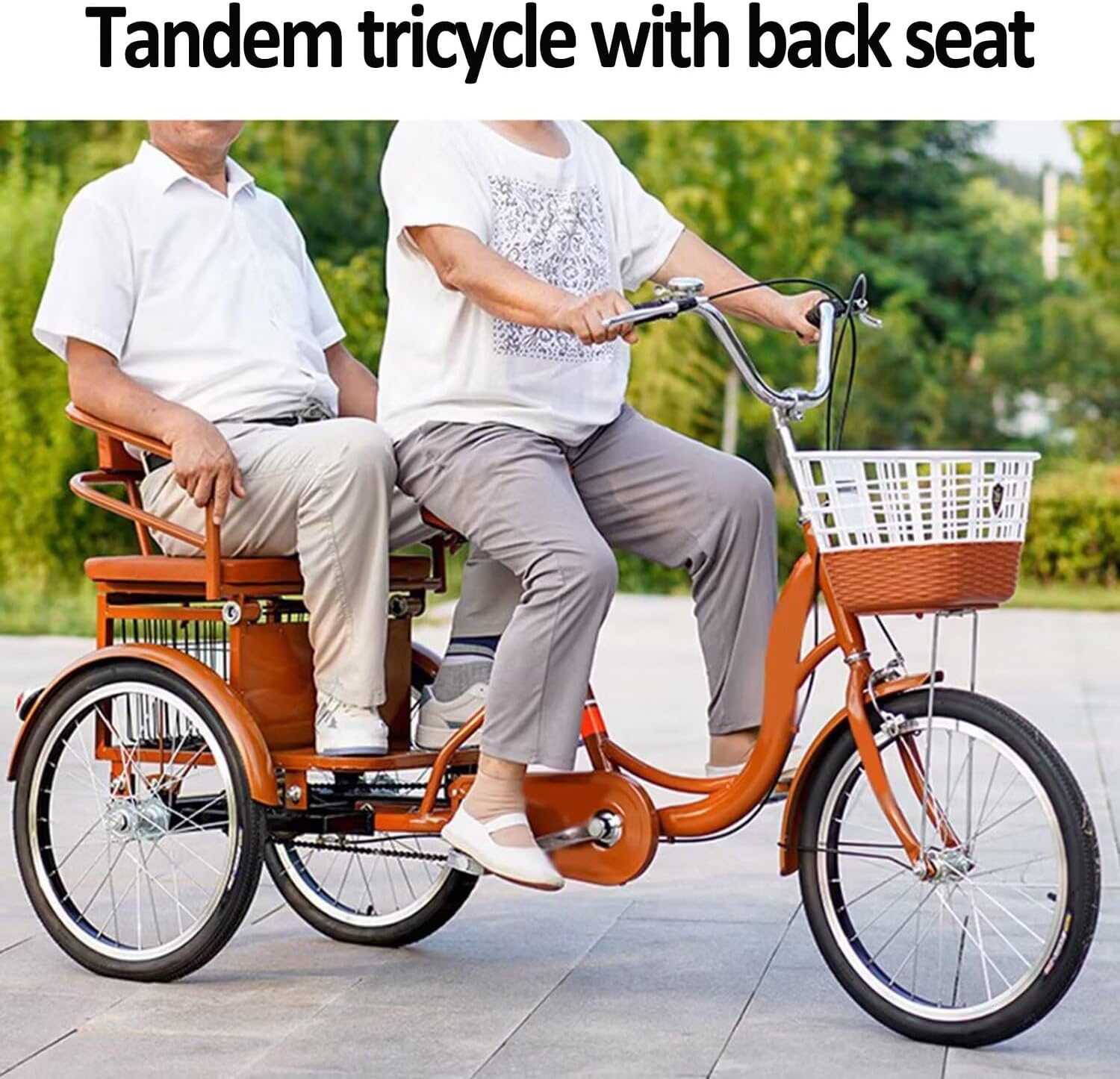 This adult and elderly tricycle, also known as a tandem trike, is designed for comfort durability. It features high carbon steel frame stability strength. The PU leather wrapped sponge saddle rear seat board/backrest ensure comfortable ride. An iron basket under the provides convenient storage. rubber grip offers secure hold, while aluminum alloy wheel hub butyl inner tube with anti-skid outer tire smooth tricycle measures 20 inches total length of 178cm. wheelbase 70cm, handlebar height from ground adjustable between 100-115cm. 70-85cm, backrest stands at 89cm ground. Wheel diameter 41.5cm, size 35*59*26cm hidden 39.5*27*21cm. Equipped dual brake lever linkage front brakes, it has maximum load capacity 150kg. can carry two people simultaneously, combining manned loaded functionalities. Available in brown black, comes disassembled package requiring assembly.