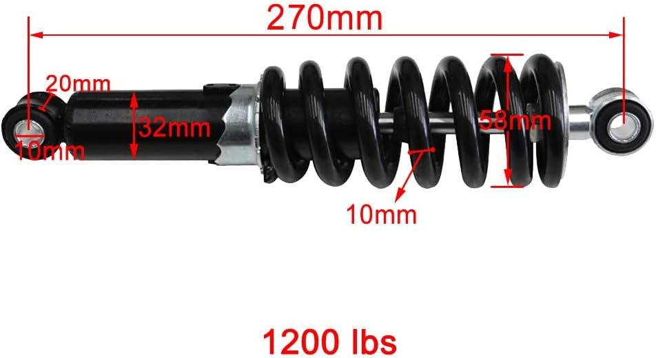 Upgrade your dirt bike, pit bike, ATV, or scooter with this 270mm (10.5") Rear Shock Absorber Suspension, engineered for performance and durability. Designed for 90cc to 150cc models, this rear suspension provides excellent damping management, ensuring a smoother and more controlled ride on off-road trails.Constructed from high-quality materials, it is durable, reliable, and built to withstand the rigors of off-road use. The shock absorber features precise measurements with a 270mm mounting hole distance (center-to-center 10mm) and overall length of 290mm, making it a perfect replacement or upgrade for pit dirt bikes, ATVs, and scooters.Package Includes: 1 × 270mm Rear Suspension Shock Absorber