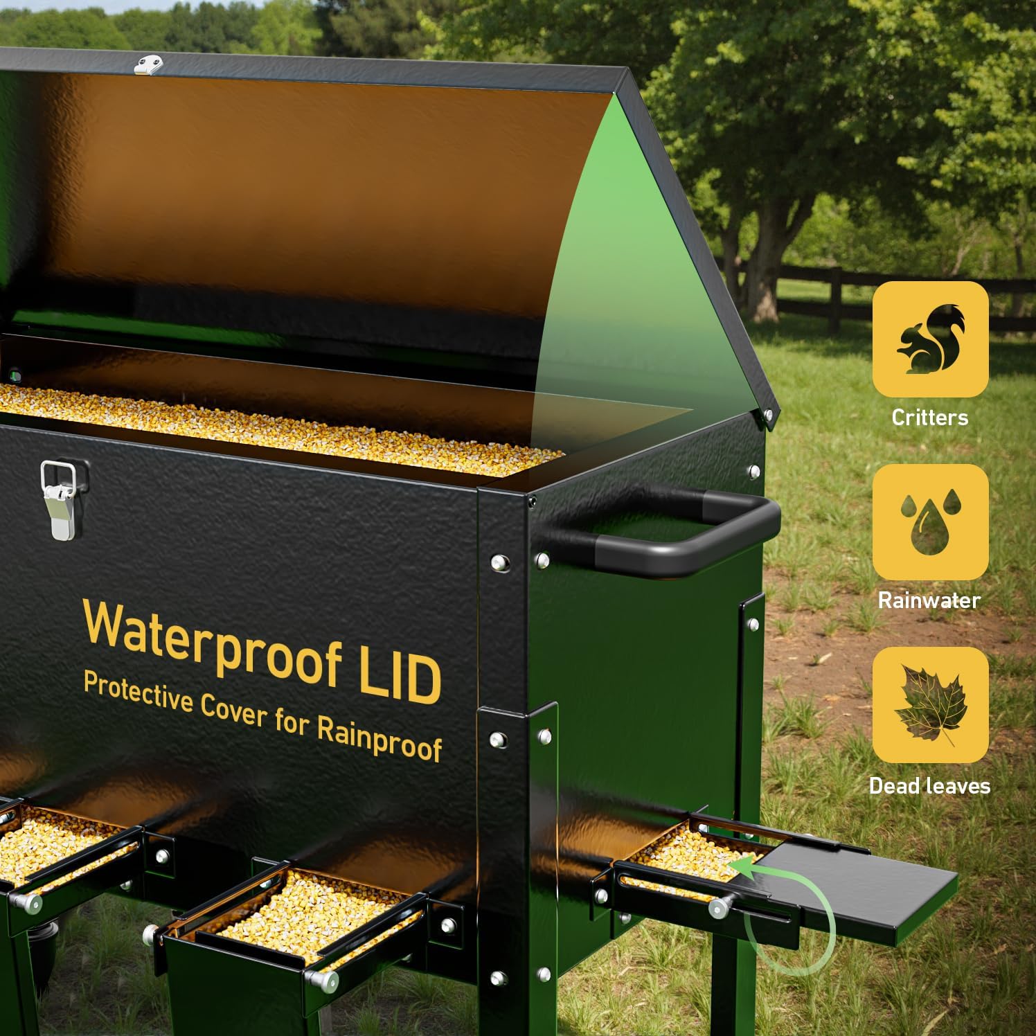 • High Quality Gravity Deer Feeder - The deer feeder is made of heavy duty, thickened galvanized steel plates with a protective painted finish, which is sturdy, rustproof and long-lasting to use, Its robust construction remains reliable even in extreme weather conditions, offering superior resistance to deformation. Designed for years of dependable use. It also features a portable design that allows easy transportation to your preferred hunting spots