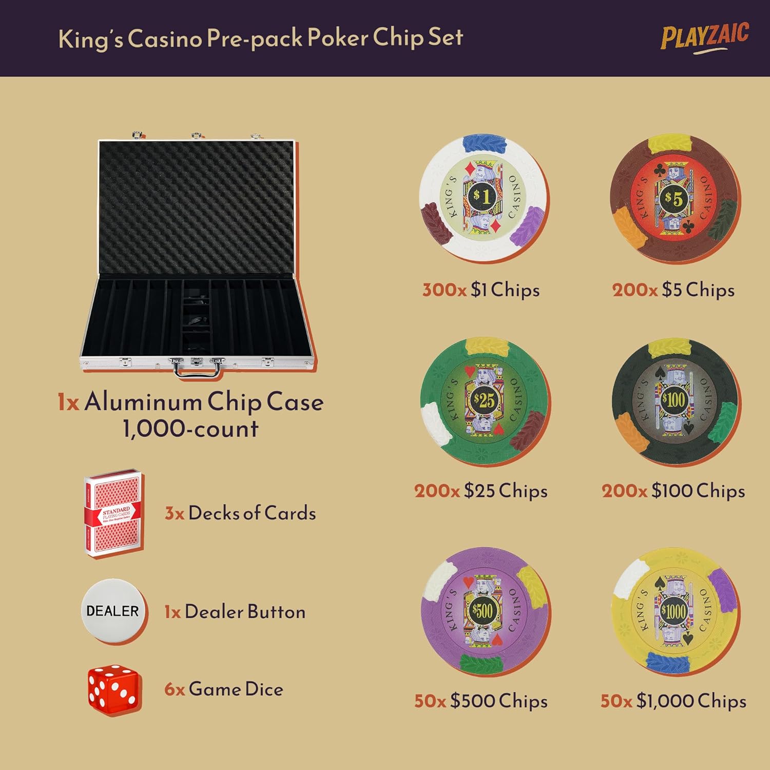 Upgrade your game night with a pre-packed King's Casino Poker Chip set designed for both serious players and casual enthusiasts. Our curated chip counts eliminate the guesswork for building a set. With balanced denominations, there's no need to research quantities or calculate mixes-- the right combination is ready to play right out of the case.King's Casino 14-gram clay composite poker chips are built for players who want a true heavyweight, casino-like experience at home. Each chip is precision-molded from a clay composite to deliver the tactile heft and rich, muted tones serious players expect.Visual distinction is central to the design. Each chip features an inlay bearing a playing-card king rendered on a color-matched background, helping players read stacks at a glance. Around the outer ring, tri-tone color blocks are molded directly into the composite for a layered visual effect what won't chip off or scuff; a laurel filigree motif runs the ring to give each chip an elevated, classic look. A subtle knurled texture on the outer ring improves grip and reduces slippage when stacking and dealing.At 14 grams, these chips click and rattle with a satisfying sound when racked and offer the weight, balance, and hand presence that hobbyists and serious players prize. Use them as a primary set for home cash games, for curated tournament play, or as a premium supplement to larger collections. King's Casino chips strike an elegant balance between classical design cues and practical gameplay features, delivering durability, clarity, and undeniable presence on the felt.