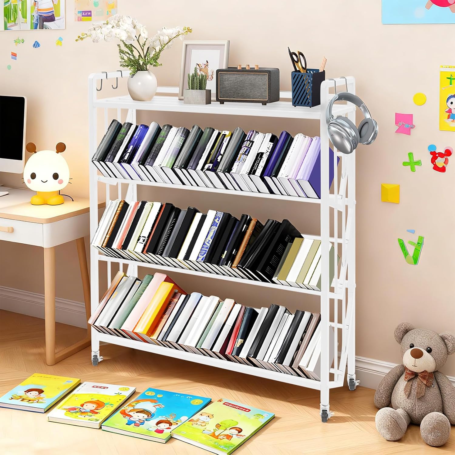 DescriptionAre you still struggling with the cluttered placement of items in your room? You won't be disappointed with this premium and sturdy bookshelf. It is both practical and beautiful, its open design allows you to access your items easily, and the large capacity of the 4 tiers provides ample space for you to place books and small items, creating a clean and tidy living environment for you.DetailsSmooth Edges: Its edges are smooth and free of burrs, which can prevent scratches on the hands and make it safer to use.Practical Hooks: They are convenient for you to hang headphones and other small items.ApplicationIt is suitable for the storage and display of books, decorations, plants, and photo frames in living rooms, studies, bedrooms, and home offices.SpecificationColor: Black/WhiteStyle: ModernShape: RectangularMaterial: IronProcess: Spray Coating, High-temperature Baked PaintAssembly Required: YesInstallation Type: Floor StandingNumber of Tiers: 4Number of Universal Wheels: 4(All With Brakes)Each Tier Load-bearing Capacity: 13.61kg/30 lbsProduct Size: 90*25*112cm/35.4*9.8*44inPackage Size: 111*27*8cm/43.7*10.63*3.15inGross Weight: 10kg/22.05 lbsNet Weight: 8.4kg/18.52 lbsPackage Included1* 4-tier Bookshelf4* Hooks4* Universal Wheels1* English InstructionAll Accessories for AssemblyNotes1. Please confirm the product size and style before purchasing.2. Please use this product within the weight capacity.3. Please assemble it according to the instructions provided.4. Please keep the wheels away from stairs and other areas where the cart could tip over. Please always use the brakes when the cart is stationary.5. Please note that this product does not contain display items such as books, magazines, and stationery.
