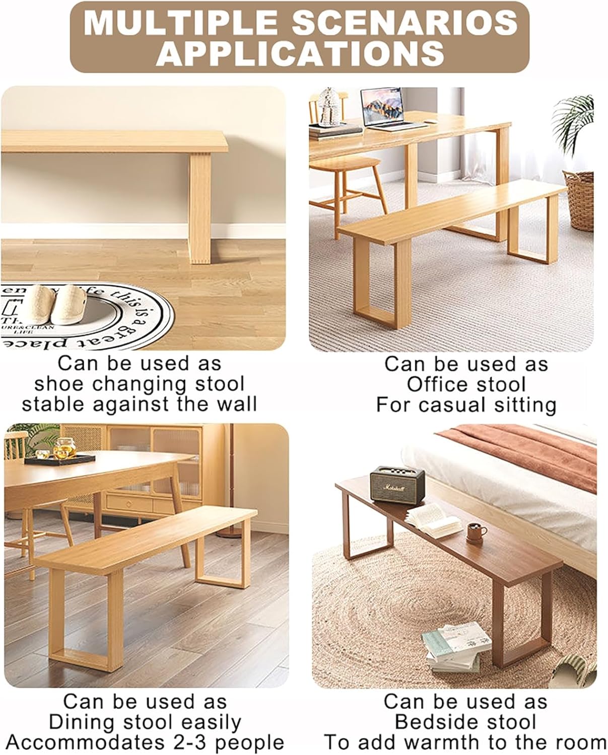 2-Seater Wooden Dining Table Chair Wooden Entryway Bench Indoor Kitchen Table BenchSturdy to withstand daily use,this bench features a robust wooden frame with smooth, sanded edges for safety and comfort. The solid wood construction ensures stability, supporting pounds, making it ideal for adults and kids alike. The slightly curved seat ensures a comfortable sitting experience, while the backless design allows for easy tucking under tables. The generous seating space accommodates two people comfortably, perfect for quick meals, putting on shoes, or casual lounging.Measuring [dimensions], this compact bench fits snugly under tables or against walls, maximizing space in small kitchens, living rooms, or tight hallways. Use it as a dining bench, a shoe bench near the door, or even as a decorative accent in your bedroom.Arriving with clear instructions and all necessary hardware, this bench assembles in minutes with minimal effort. The smooth wooden surface resists stains and is effortless to clean—just wipe with a damp cloth to maintain its fresh, polished look.Perfect for Any Room:Entryway: A stylish spot to sit while putting on shoes or storing bags.Kitchen/Dining Area: Use as a wood dining bench for extra seating.Bedroom: Ideal as a bench at the foot of the bed for blankets or decor.Living Room: A chic addition for extra seating or as a side table.Notice:Children are not allowed to climb on or play with the storage chest for safety reasons.Assemble this product on a soft surface to prevent scratches.Solve the label removal method: You can use a hair dryer to heat the label.When a certain heat is reached, the label is easy to tear off.Due to manual measurement, please allow for a size deviation of 1-2 centimeters. Please refer to the actual product received for accurate dimensions.