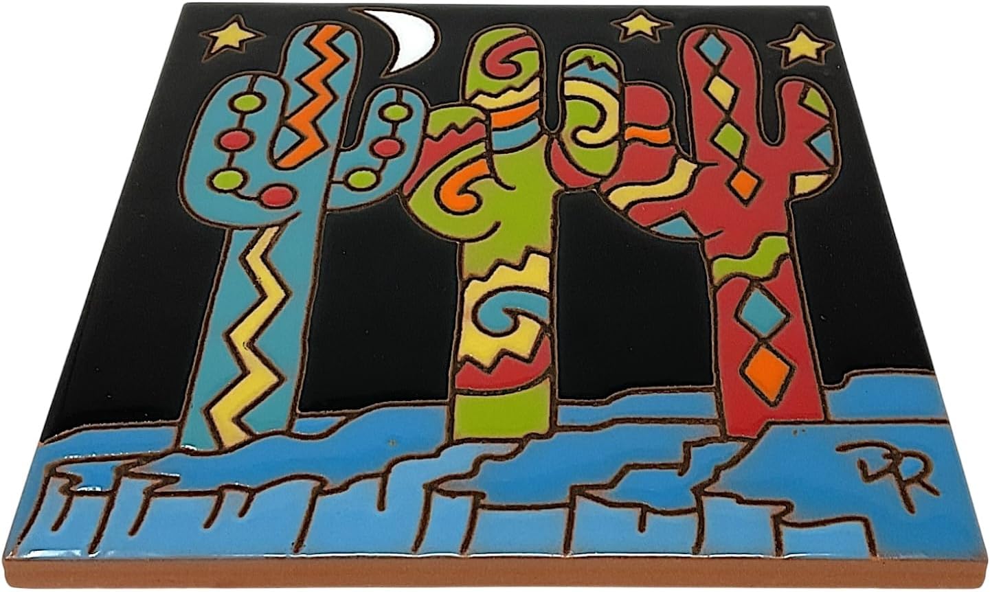 Southwest Saguaros decorative tile. Tiles are hand glazed and kiln fired in Tucson, AZ. This unique and durable piece of art is created using an old world Spanish technique known as Cuerda Seca or Dry Line. Made from authentic red quarry tile. Lead free non-toxic. Wooden backer with notch for hanging. Can be used for indoor or outdoor use. Fade and stain resistant. Can be used as trivets, hot plates, coasters, decorative accents for kitchen bath or pool, house entry etc. Approximately 6 by 6 inches.
