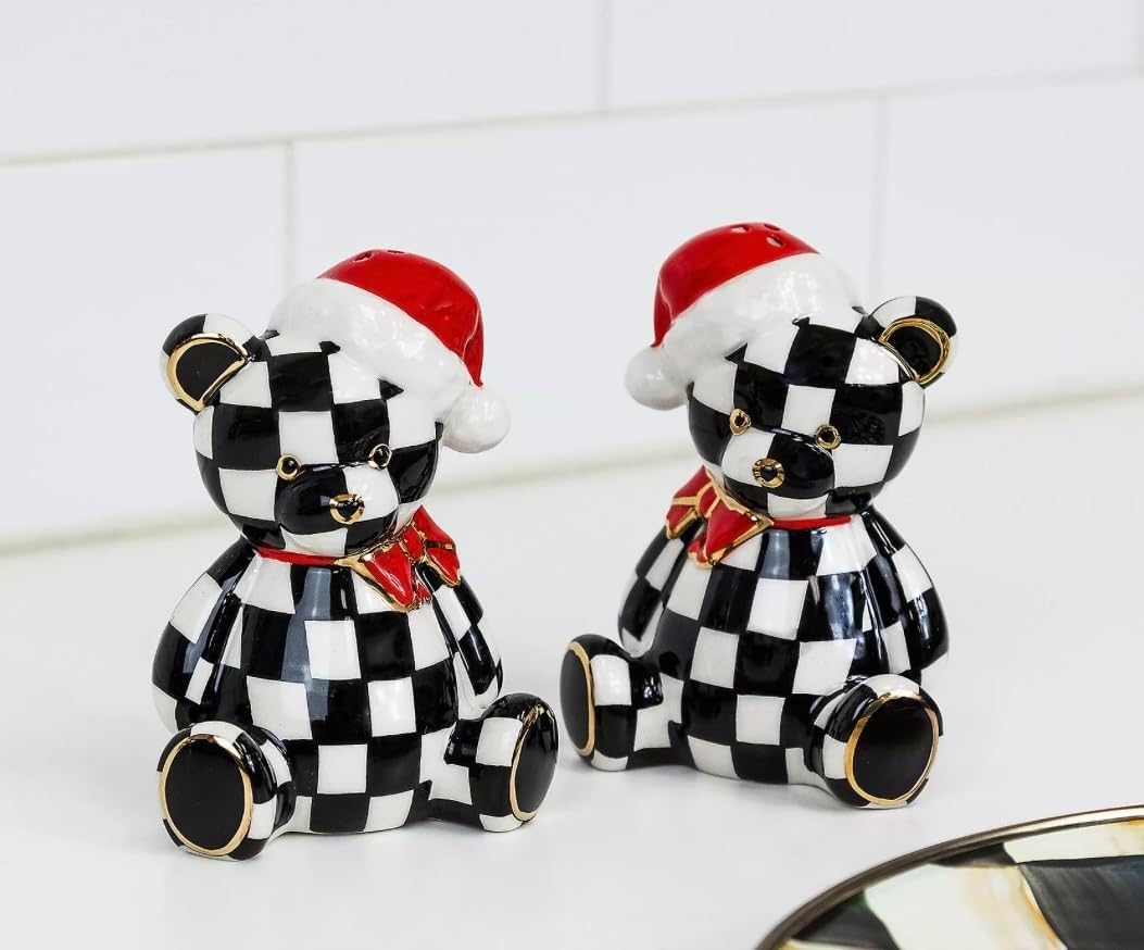 An adorable addition to your holiday table, this exclusive Santa Bear Salt & Pepper Set features the signature Mackenzie-Childs' Courtly Bears all dressed up for the occasion. The set includes: one salt shaker and one pepper shaker, Dimensions: 2.5" wide, 1.75" deep and 3" high for each Materials: Ceramic Care & Use: Hand wash