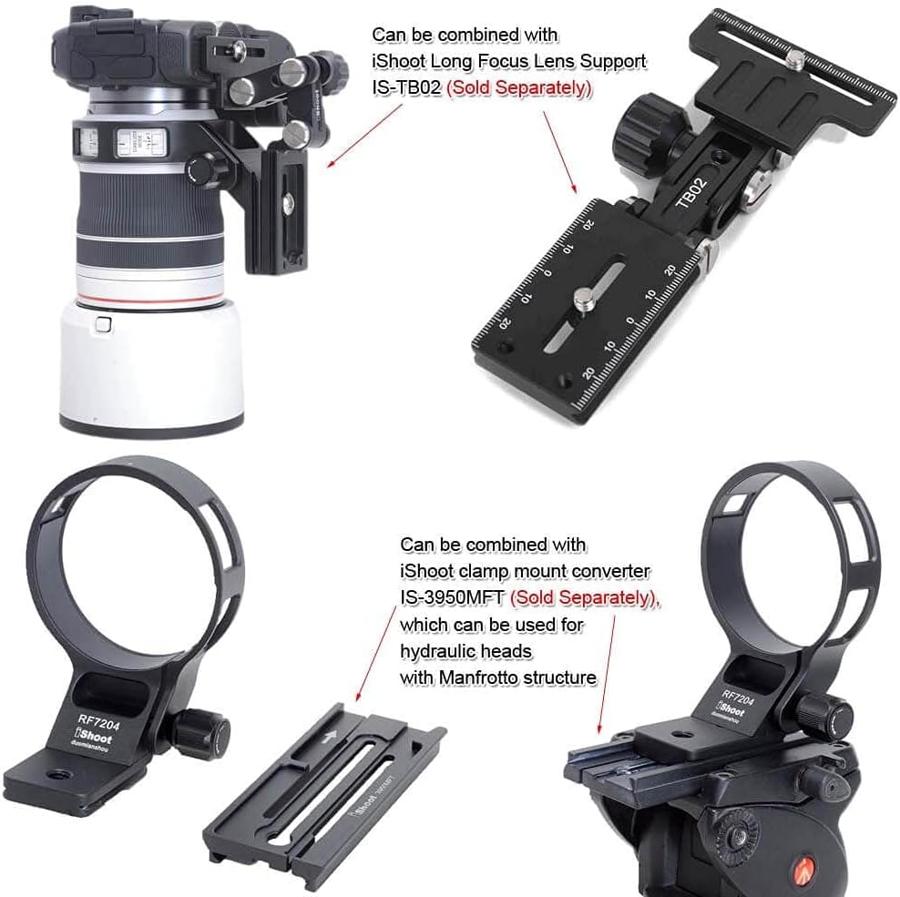 iShoot Lens Collar Tripod Mount Ring IS-RF7204 Compatible with Canon RF 70-200 f/4L IS USM Lens Bottom is 39mm ARCA Fit Quick Release Plate Feature, Compatible with Tripod Head & Clamp of RRS / ARCA-SWISS Fit Main Features: 1. The tripod mount ring is tailored to the shape and structure of the Canon RF 70-200 F4L IS USM lens, retains the switch function, and the tripod ring fits closely with the lens. This lens collar can't be used for other lenses; 2. Stickers cannot be attached at the installation position, otherwise, the tripod ring cannot be installed, so if any, remove them. After installation, the camera can only shoot horizontally, not vertically, or be rotated; 3. The tripod ring adopts irregular shape, and the edges and corners are polished. The shortest inner diameter of the lens holder is about 79mm, and the surface contacting the lens is affixed with 3M plastic film, preventing the lens from scratches; the maximum width of this contact surface is 22.5mm; net weight is about 170g; 4. The lens collar IS-RF7204 can be combined with clamp mount converter IS-3950MFT (Sold Separately), which can be used for hydraulic heads with Manfrotto structure. Compatible with: Canon RF 70-200 f/4L IS USM Lens Cannot be used for other lenses, please do not buy it if your lens is not the specified model. Stickers cannot be attached at the installation position, otherwise, the tripod ring cannot be installed, so if any, remove them. Package Includes: 1 x iShoot Tripod Mount Ring IS-RF7204 Compatible with Canon RF 70-200 f/4L IS USM Lens (Note: The other items in the photos not listed here are for illustrating only, not included)