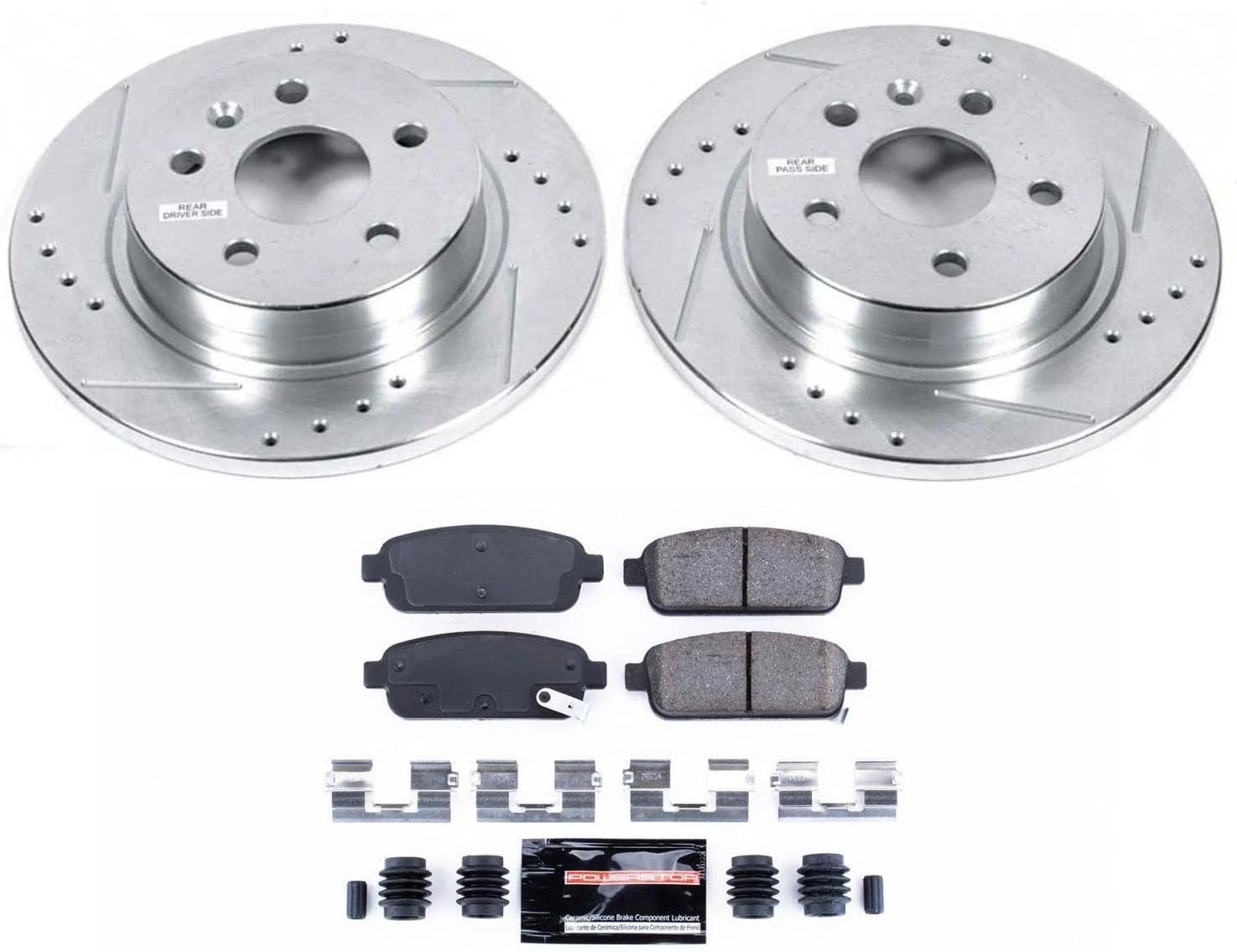 Product: PowerStop Z23 Evolution Sport Brake Pads and Drilled & Slotted Rotor KitWhat’s in the Box: This premium Z23 brake kit upgrade includes Z23 Carbon-Fiber Ceramic Brake Pads, Drilled & Slotted Rotors, Rubberized Shims, and Installation HardwareEngineered For:Long Lasting Performance Seekers - Significant performance improvements above OE brakes with a 3 year / 36,000 mile warranty to back it upThe Enthusiast - Your do it all option to keep you braking quiet and dust free without sacrificing stopping power and temperature control in high demand situationsBolt on ready - This kit includes premium stainless steel hardware for an easy install. No modifications needed to your vehicleComponent Breakdown:The Pads (Z23 Formula) - The included Z23 pads use a low-dust ceramic formula reinforced with carbon fibers. This provides severe-duty stopping power without sacrificing everyday drivability or creating noiseThe Rotors - Zinc plated to protect against rust. The precision drilled holes and rounded slots maximize cooling and wipe away gas/debris—critical for keeping temperatures down during all operating conditionsThe Hardware - High-quality stainless steel installation hardware makes an easy install even easierInstallation: A true bolt-on upgrade. No modifications required. Includes all necessary stainless-steel hardware for a hassle-free installThis Item Fits:Rear: 2013-17 Buick Encore Rear: 2011-13 Chevrolet Cruze Rear Disc Rear: 2014-15 Chevrolet Cruze GAS; Rear Disc Rear: 2016 Chevrolet Cruze Limited Rear Disc Rear: 2013-16 Chevrolet Sonic Rear Disc Rear: 2015-17 Chevrolet Trax Rear Disc