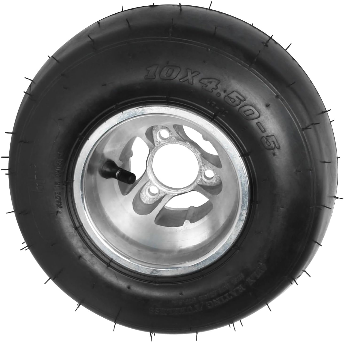This 10x4.50-5 Go Kart Tire and Wheel Assembly is designed for reliable performance on a wide range of off-road and utility vehicles. Featuring a smooth slick tread, this tubeless tire delivers excellent traction and stability on dry surfaces, making it ideal for racing, recreational, and utility use. Mounted on a durable 5-inch rim, the wheel uses a 3-stud mounting pattern with 48mm bolt hole spacing and 8.5mm bolt holes, ensuring a secure and precise fit. The tire measures 250mm (9.84") in height and 135mm (5.31") in width, offering balanced handling and control. Built with a 4-ply rating and capable of handling up to 57 PSI, this tire is tough enough for repeated use on go karts, ATVs, golf carts, buggies, lawn mowers, drift trikes, and other small vehicles. Not intended for highway use. Package Includes: 4 × 10x4.50-5 Go Kart Tire with 5" Rim (Smooth Slick Tire)