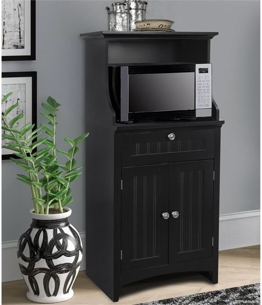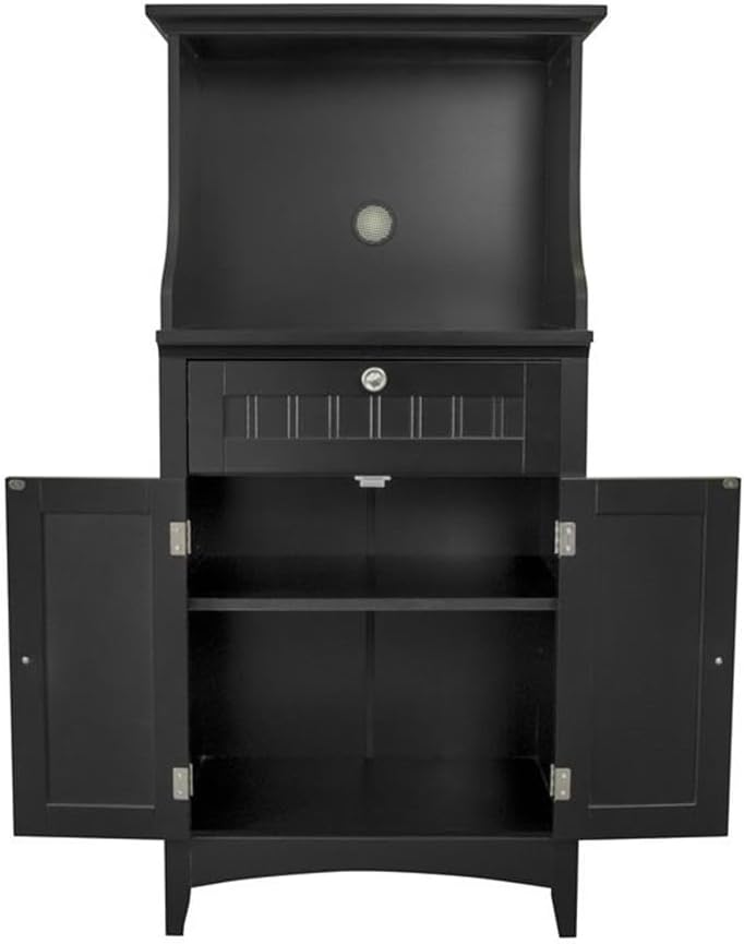 Free up valuable counter and cabinet space with this microwave, coffee maker, etc kitchen organization station. The Pemberly Row Model 25603 black kitchen storage item features a spacious drawer and hidden storage behind two raised panel doors.Features :- Materials: Paper laminate wood- Finish: Black- Durable Black Painted, Raised Panel, Vein Lined doors.- Striking black laminate side panels and shelves.- Spacious drawer on high quality nylon and metal drawer guides.- Doors feature durable, high quality black paint over medium density fiberboard.- Brushed aluminum finished door and drawer pulls.- One adjustable and removable shelf behind doors.- Tapered front rails and arched kick panel.Specifications :- Product Dimensions : 48"H x 23.5"W x 15.75"D- Product Weight : 53 lbs- Product Dimensions : (Microwave Compartment) 16"H x 20"W x 15"D