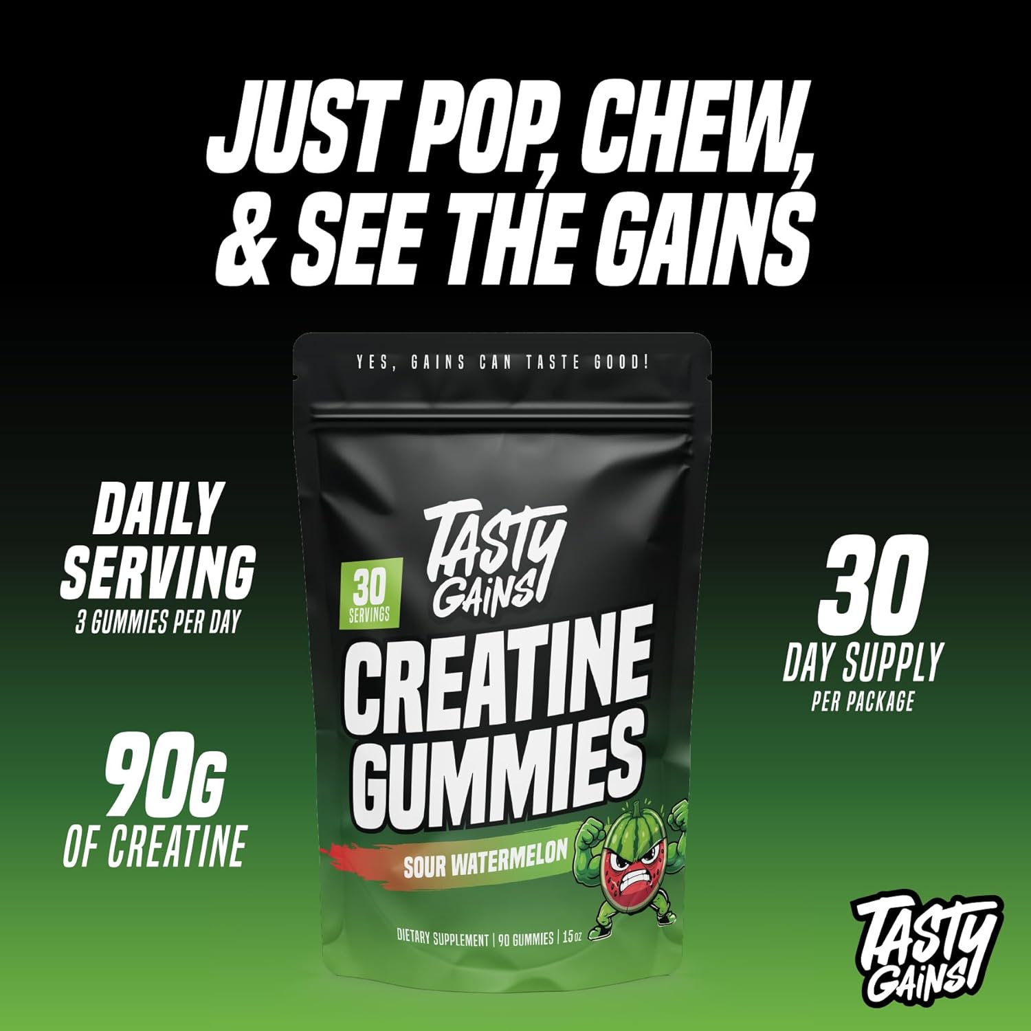 Tasty Gains Creatine Gummies are revolutionizing the way fitness enthusiasts consume creatine, eliminating the unpleasant taste often associated with traditional creatine monohydrate powder. Proudly made in the USA, specifically in Arizona, each gummy is carefully infused with 1 gram of high-quality creatine monohydrate, ensuring you receive the optimal amount needed for muscle building and performance enhancement. Our gummies are formulated with a low-calorie, reduced-sugar recipe, making them a guilt-free treat that supports your fitness goals. In addition to their health-conscious formulation, these gummies are also vegan, gluten-free, and non-gmo, allowing a wide range of individuals to enjoy their benefits without compromising dietary restrictions or preferences. Designed with convenience in mind, Tasty Gains Creatine Gummies are perfect for those on the go. No longer do you need to worry about the mess and hassle of mixing powder; simply pop a few delicious gummies to get your desired dose of creatine. This ease of use makes it simpler than ever to stay consistent with your supplement regimen, ensuring you never miss a serving. Each bottle provides a full 30-day supply, making it an economical and practical choice for both men and women aiming to maximize their muscle gains and athletic performance. Beyond the convenience and taste, Tasty Gains Creatine Gummies offer substantial benefits for anyone looking to enhance their workout results. Creatine is well-known for its ability to boost energy levels, improve muscle recovery, and support overall muscle growth. By incorporating these gummies into your daily routine, you can expect to see improvements in your workout endurance, strength, and recovery times, helping you push harder and achieve your fitness goals more efficiently. Whether you're a seasoned athlete or just starting your fitness journey, Tasty Gains Creatine Gummies are an excellent addition to your supplement stack. They provide a simple, tasty, and effective way to incorporate creatine into your diet without the drawbacks of traditional powder forms. Enjoy the sweet taste and the myriad of health benefits as you work towards a stronger, healthier you. Tasty Gains is committed to providing top-quality products that support your fitness journey, ensuring you have everything you need to succeed.