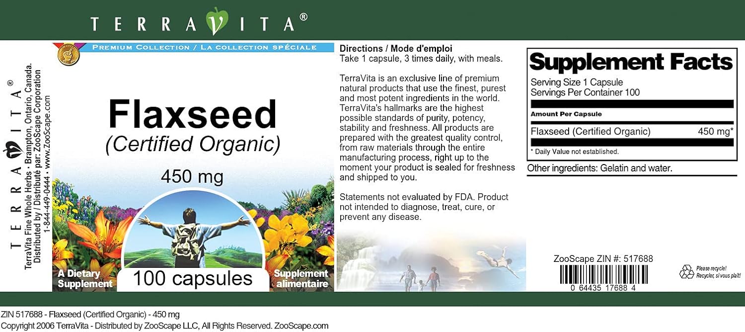 Flaxseed (Certified Organic) - 450 mg (100 capsules, ZIN: 517688)Packaged in the United States in a GMP certified facility (Good Manufacturing Practice).No fillers.Manufacturer: TerraVitaSize: 100 capsulesEasy-to-swallow Capsules in a sealed bottle.Ingredients: Gelatin, Water, Flaxseed - 450 mg (Certified Organic)