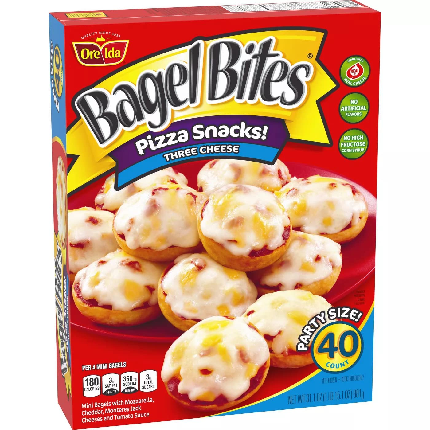 Bagel Bites Three Cheese Pizza Snacks offer a quick and easy snack that kids love and parents can easily serve. Our mini pizza bagels are topped with mozzarella cheese, cheddar cheese, Monterey Jack cheese and tomato sauce for a mouthwatering flavor that excites taste buds. Whenever you serve our mini pizza bagels, they're always a hit.Try our frozen appetizers at a party or as an after school snack. Each serving of Bagel Bites has 6 grams of protein, contains 0g trans fat, and no artificial flavors or high fructose corn syrup. Bake them in the oven or toaster oven for a crispy finish, or microwave them for a quick snack. Keep these mini cheese pizza bagels frozen until ready to eat. Please note that our warehouse packs everything as tightly as possible to ensure the item(s) remains frozen/refrigerated during transit and the coolant surrounds the item(s). As dry ice dissipates and gel packs thaw, this will create pockets of space in the package whereby products can shift around. Upon receiving the delivery, please immediately place your items in your refrigerator or freezer. If you are away when your package arrives, please watch your email for delivery confirmation. Upon delivery, plan for someone to place them in a refrigerator or freezer as soon as possible.