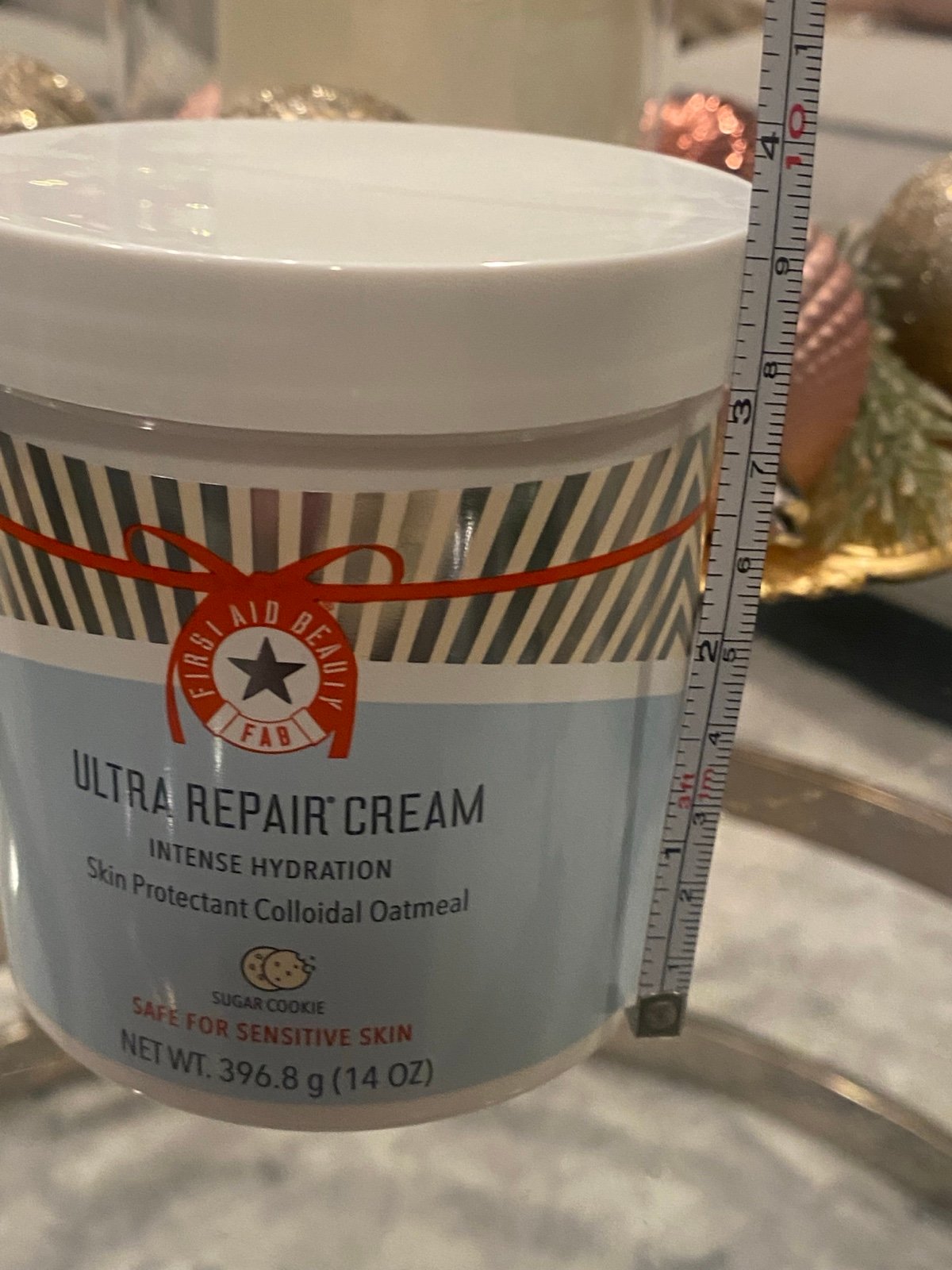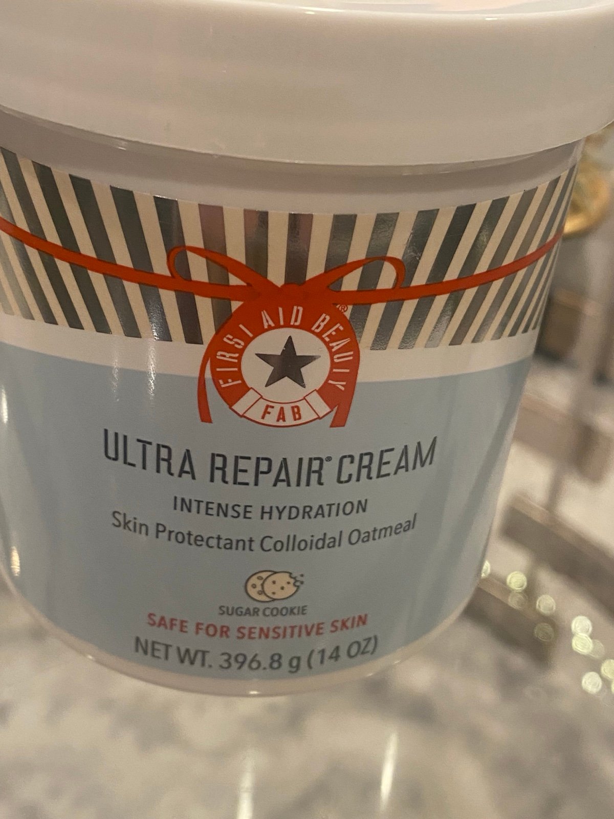 First Aid Beauty Large 14oz size Ultra Repair Cream in sugar cookie scent. Nourish your skin with First Aid Beauty's Ultra Repair Cream. Ideal for sensitive skin. Features soothing colloidal oatmeal. New never used but seal removed. See pictures.