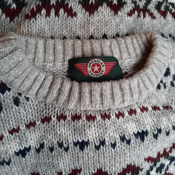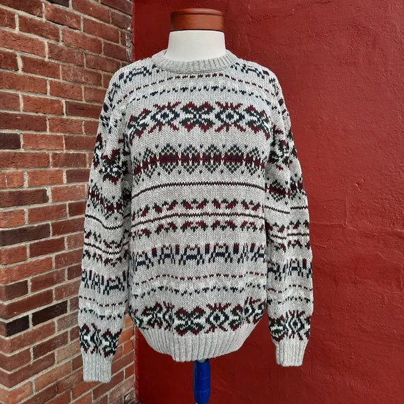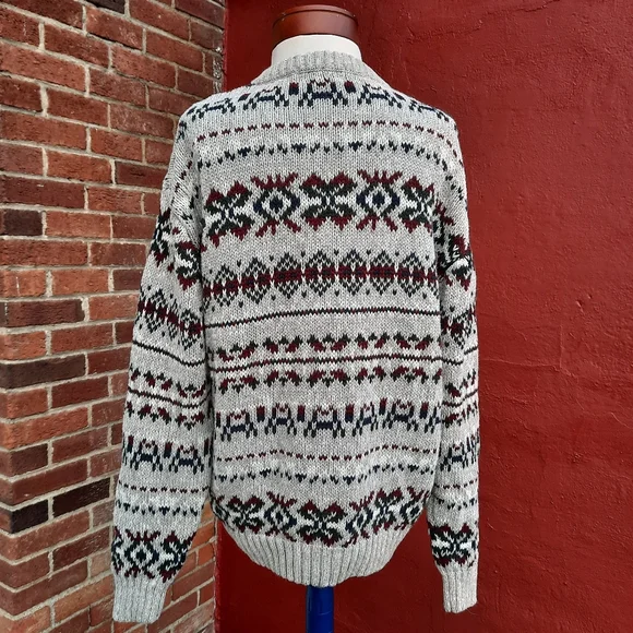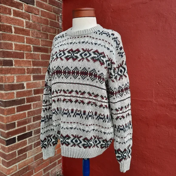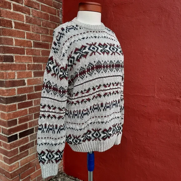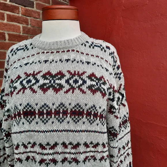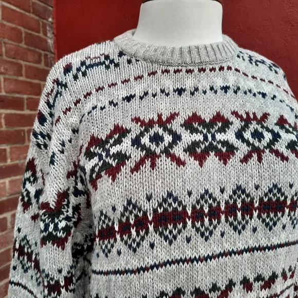 Vintage 90's Nordic Fair Isle Oversized Grandpa Cotton Sweater, Unisex fit::: Size Men's Large, fits Ladies size oversized Large, X-Large-0X (12-14) so please see measurements for best fit :) Marled gray/white looks almost tan (see closeups) with dark green, red, navy blue pattern; crewneck pullover with rib knit details on collar, sleeves; soft Ramie/ Cotton blend; excellent condition and cleaned in fragrance free sensitive detergent. Amazing find!Thank you so much for Shopping Small with me here at StyleBright! Jen #sustainable boho preppy southwestern Y2K VSCO gorpcore mountain lodge resort apres ski Scandinavian winter fall Vintage 90's Nordic Fair Isle Oversized Grandpa Cotton Sweater