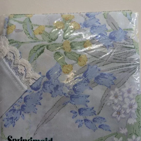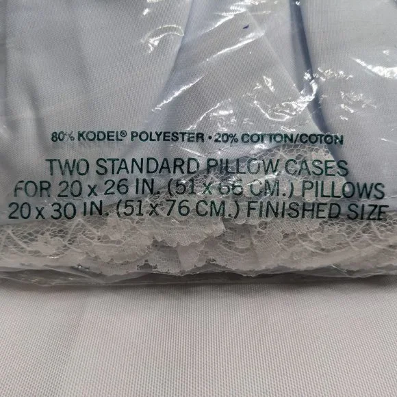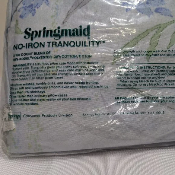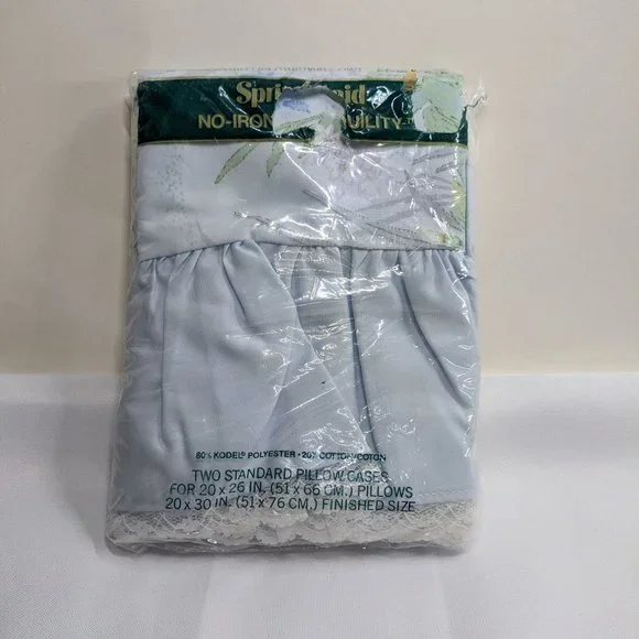 Vintage 1970s Springmaid NO-IRON TRANQUILITY standard pillowcase set. You get a set of pillowcases. This floral pattern features garden flowers against a light blue background with a ruffle edged trimmed in lace. They are 80% KODEL polyester/20% cotton, are machine washable/dryable and No-Iron.Standard size: 20" x 26" interior; 20" x 30" finished sizeR