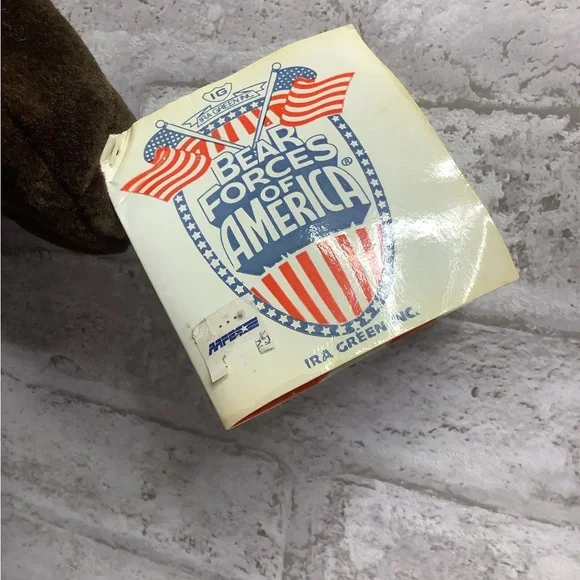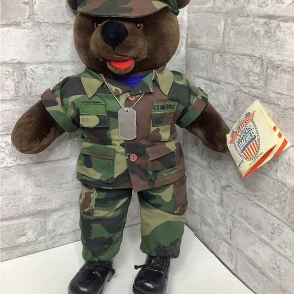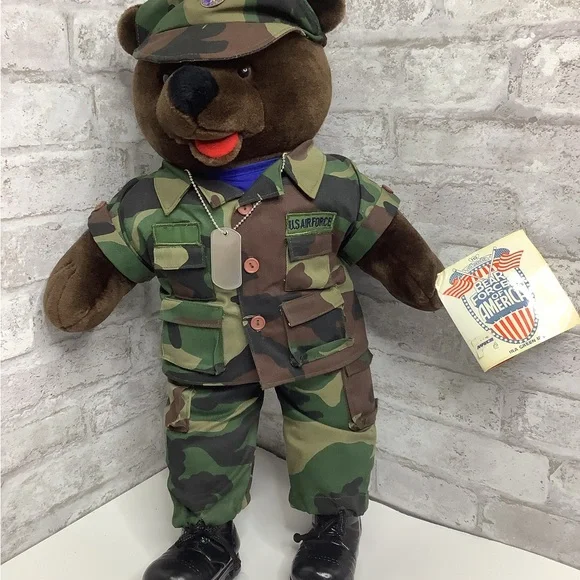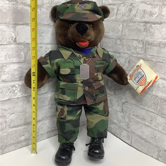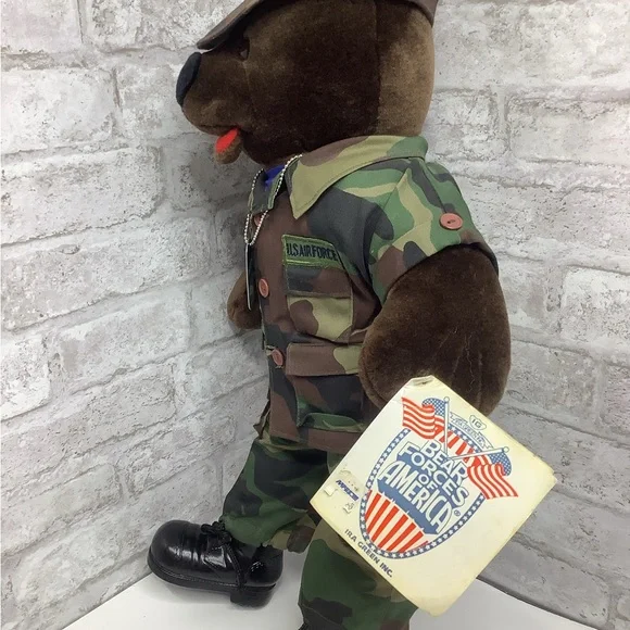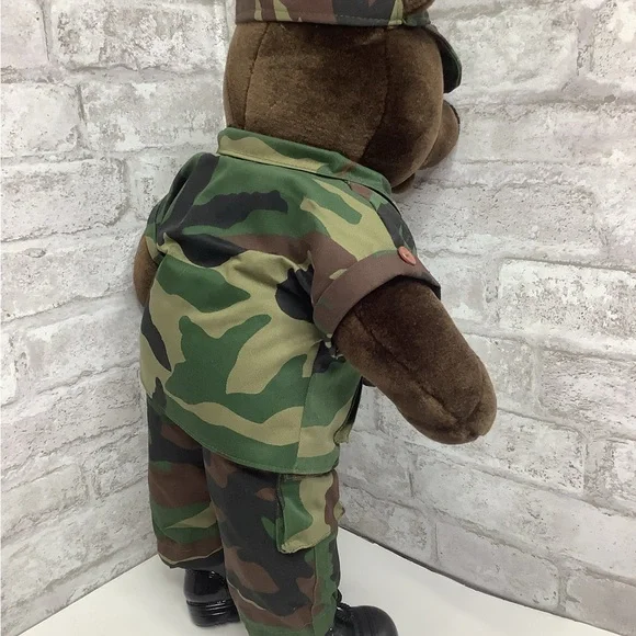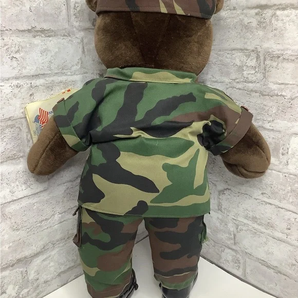 This vintage Bear Force of America plush bear stands at 18 inches tall and is dressed in a US Army Military Camo Uniform. The brown bear features retro design elements, making it a collector's item for bear enthusiasts. With its authentic-looking attire and vintage charm, this plush bear is a unique addition to any teddy bear collection.