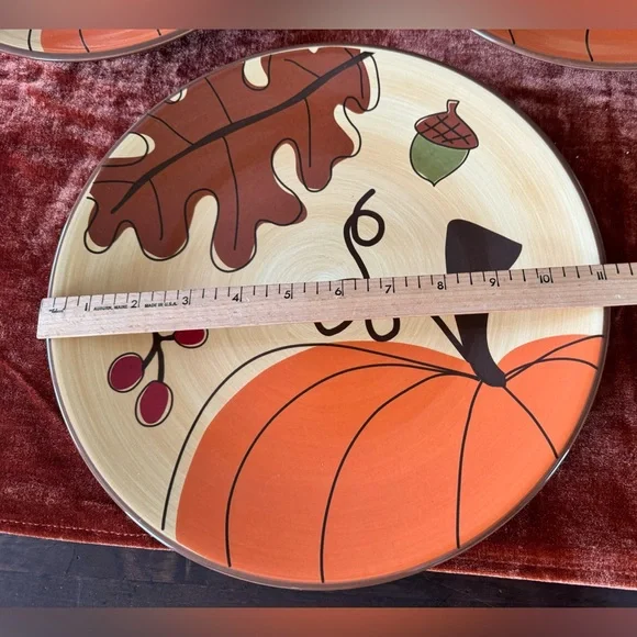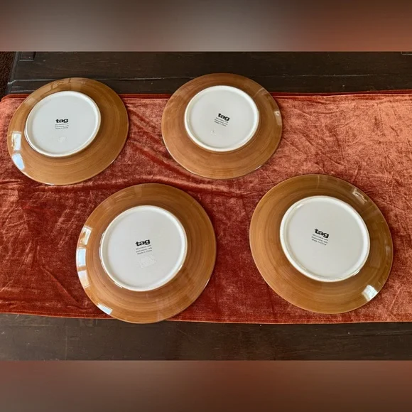 Tag Brand Set of 4 Fall Dinner Plates 🍂 .These fun Tag plates are great for your Autumn and Thanksgiving gatherings. Use them as your primary place settings, or to accent an extended table scape or use as candle holders. .Sold as a set of 4. Each plate is approximately 11 inches in diameter. Fabulous condition..Dishwasher and microwave safe too!