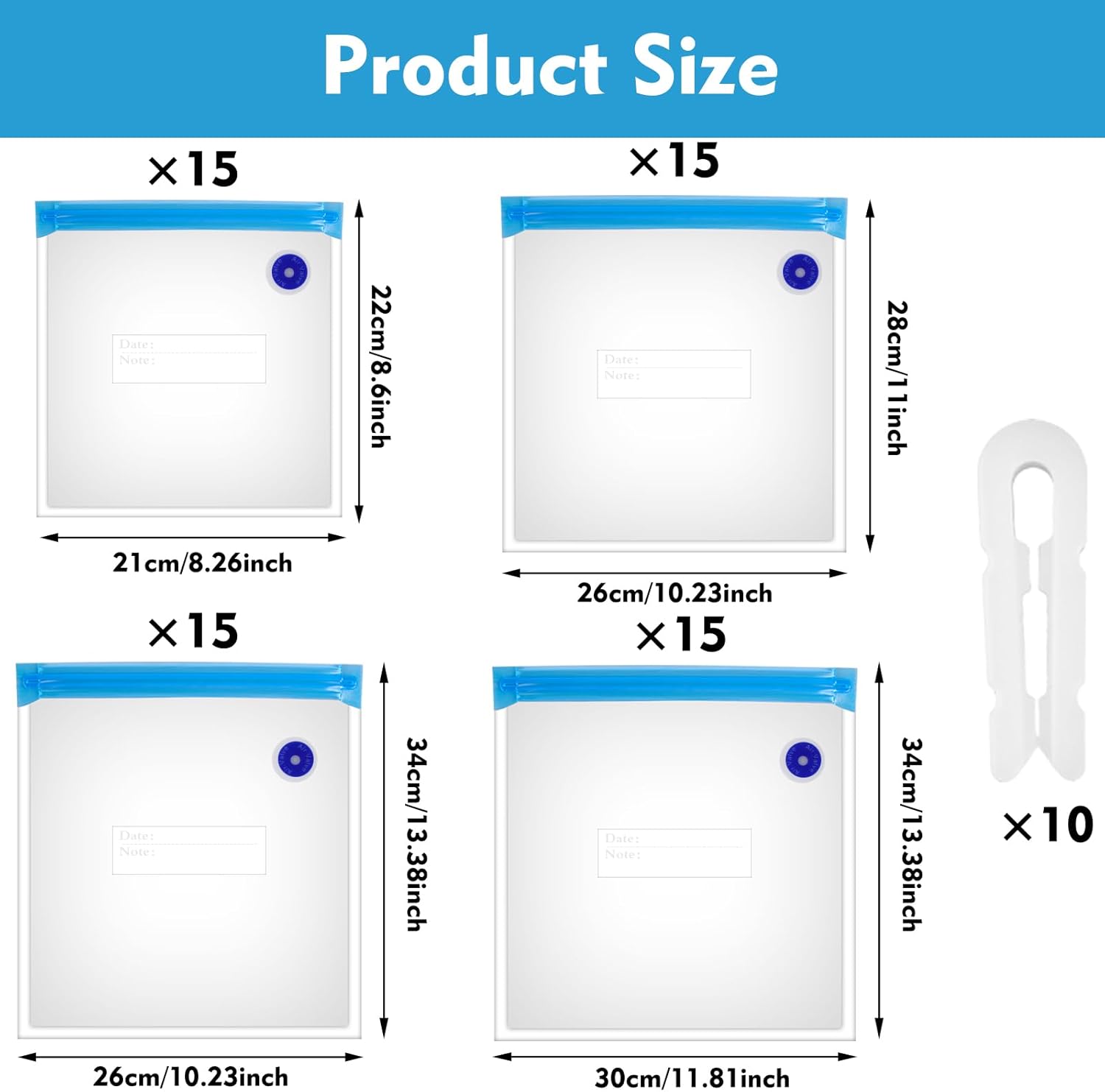 Leak Proof Design: vacuum sealer bag for food has double leak proof zipper, which is waterproof and serviceable, reliable for keeping food fresh and your freezer clean and neat. Daily Maintenance: the vacuum food storage bags are easy to clean with vinegar, dish soap and warm water then store them in a clean and dry place before using again. Specifications: Material: PEVA Color: clear Size: approx. 8.7 x 8.3 inch, 10.2 x 11 inch, 10.2 x 13.4 inch and 11.8 x 13.4 inch Package includes: 60 x Vacuum Sealer Bag Notes: Manual measurement, please allow slight errors on size. The color may exist a slight difference due to different screen displays.