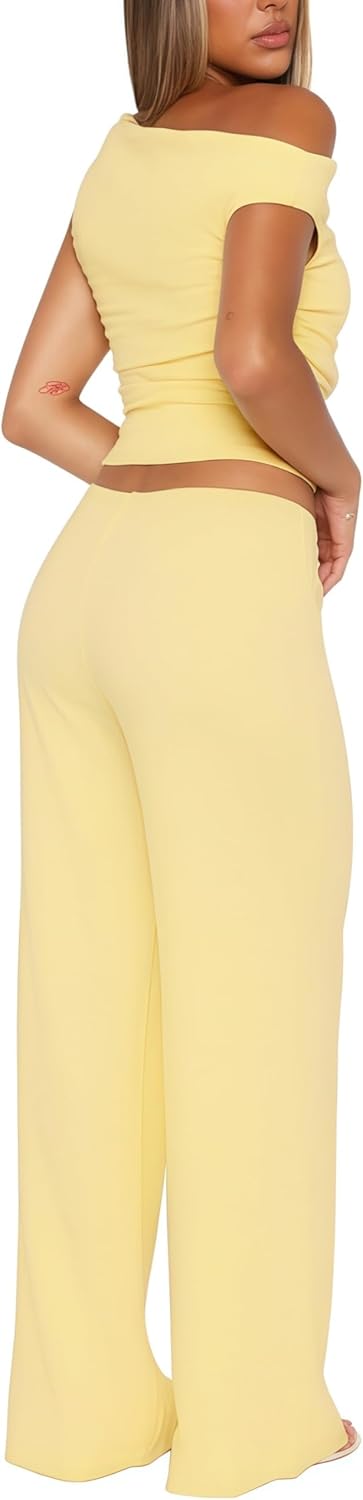 Womens Casual Soft Sleeveless One Off The Shoulder Tank Crop Tops Wide Leg Pants Two-Piece Outfits Set