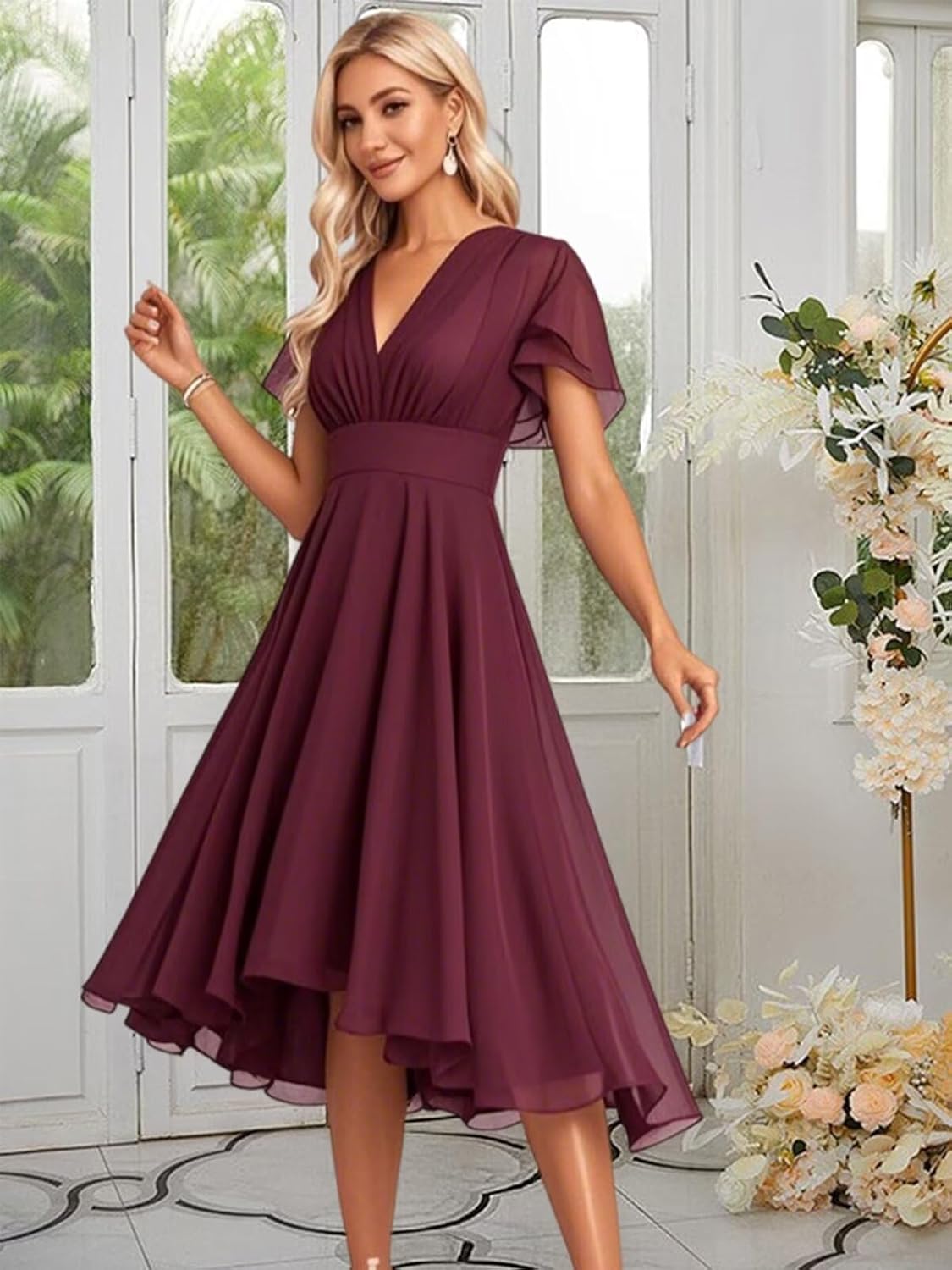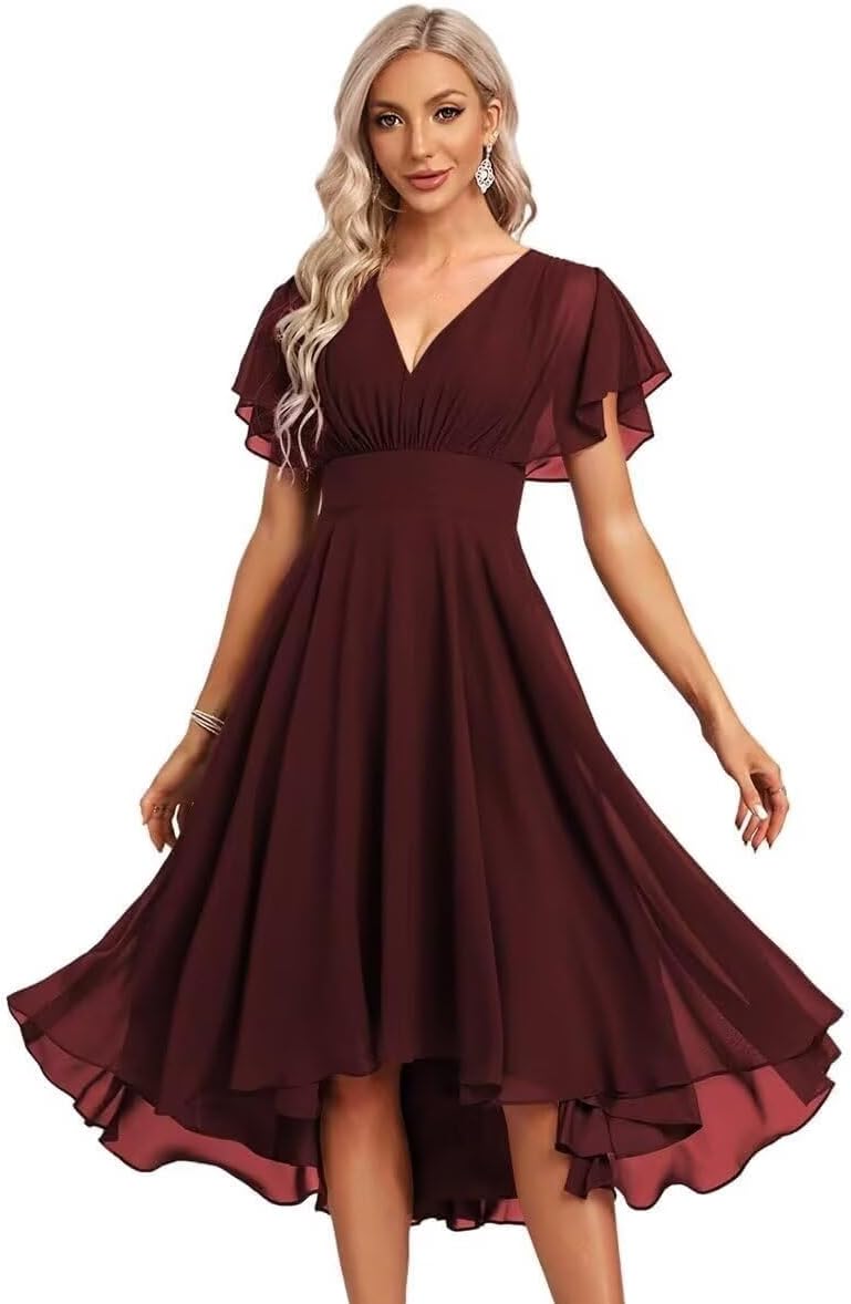 Women's Chiffon Bridesmaid Dresses Ruffle Sleeves V Neck Formal Dress Short Bridesmaid Dress