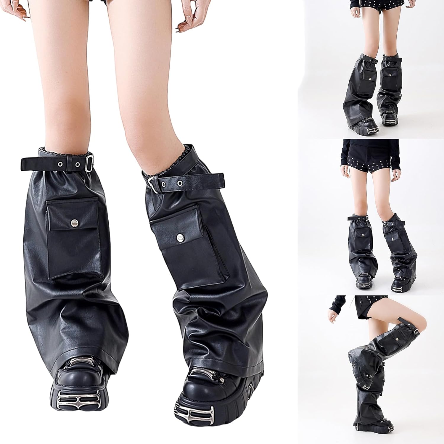 Leg Warmers, Women Subcultures Black Leg Warmers with Flap Pocket Punk Rock Faux Leather Flared Boot Covers Baggy Socks Streetwear