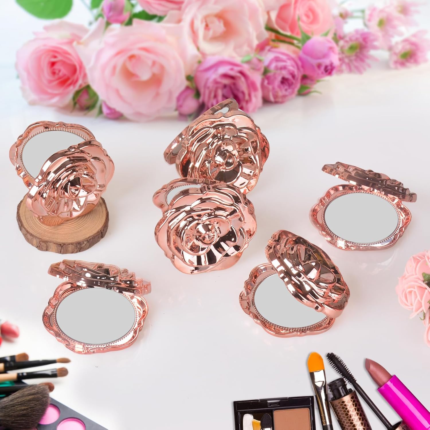 Features: Widely applied: The quinceanera party favors for guests are suitable for various formal or informal occasions, such as parties, birthday parties, dances, shopping, travel, dating, etc., making you look more elegant and mature. Easy to use: The wedding party gifts are featured with a hinge design, so you can easily turn on the mirror by opens at a side hinge, compact and small, can be easily put into your pocket, wallet, handbag, and cosmetic bag, so that you can make up anytime and anywhere. Specifications: Material: plastic Color: rose gold Size: approx 2.56 inches in diameter Package includes: 100 x Rose compact mirrors 100 x Organza gift bags 100 x Thank you gift tags Notes: Manual measurement, please allow slight errors on size. The color may exist a slight difference due to different screen displays.
