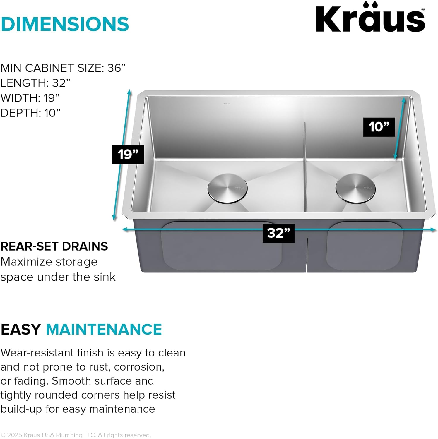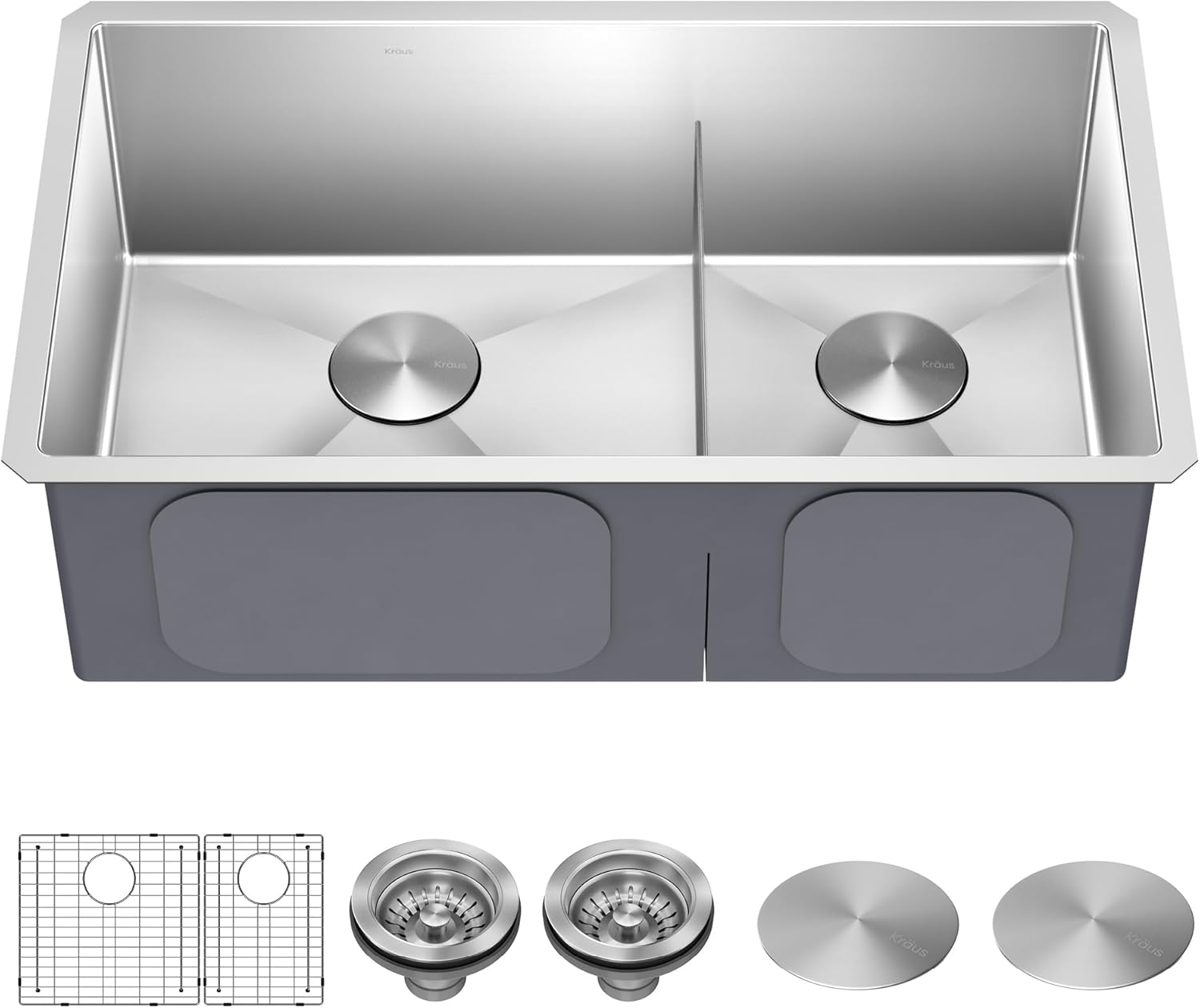 Product Description The KRAUS Standart PRO stainless steel kitchen sink features a sleek modern design with easy-to-clean rounded corners. Made with heavy-duty TRU16 gauge stainless steel for long-lasting durability with great resistance to corrosion, dents, and damage. Undermount sink installation creates a clean transition from sink to countertop and simplifies cleanup by letting you wipe water and crumbs right into the sink. Large NoiseDefend sound dampening pads help absorb noise and vibration. Smooth satin finish and rounded corners make this stainless steel sink easy to keep clean, with channel grooves for easy draining. Comes with protective bottom grid, drain assembly with strainer, template, and mounting hardware for undermount kitchen sink installation. From the Manufacturer Kraus is a leading kitchen sink manufacturer, with a wide range of products made with advanced technology to exceed industry standards. To ensure exceptional quality, Kraus products are always made with premium materials as well as cutting-edge designs. All Kraus products are created with an eye for fashion as well as function, with an emphasis on quality craftsmanship and functional design. The focus is always on providing outstanding value to all Kraus customers, and making it affordable to create a kitchen they love. "Love this sink! I bought this sink from Amazon about a year ago and it has been a great addition to our kitchen. It is large enough to soak our largest roasting pan. It is a workhorse. Made extremely well. The sound proofing construction dulls the echoing type sound that most stainless steel sinks have. MONEY WELL SPENT!"