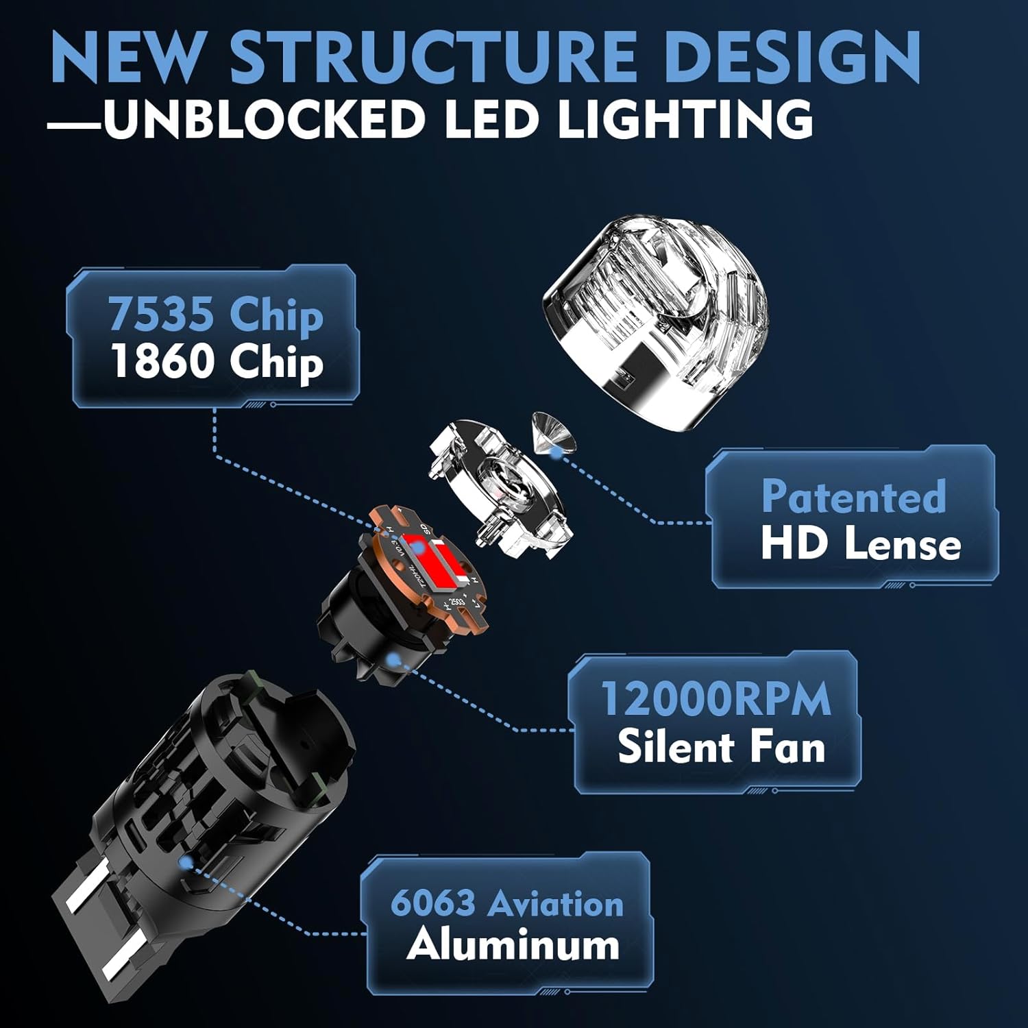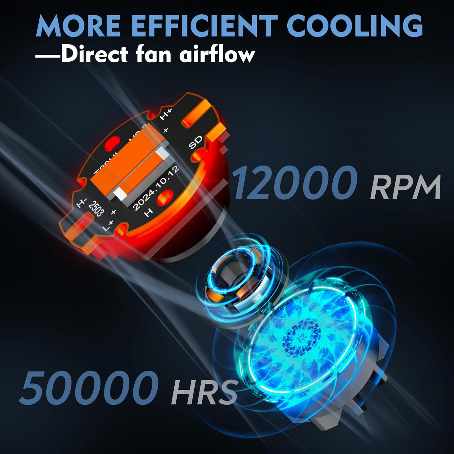 • MID-MOUNTED TURBO FAN DESIGN. No Top Fan Blockage – Unlike traditional white light bulbs with top-mounted fans, our central cooling ensures 360° unobstructed white light output from the bulb's crown - provides clear visibility in reverse maneuvers, brake signaling and DRL.