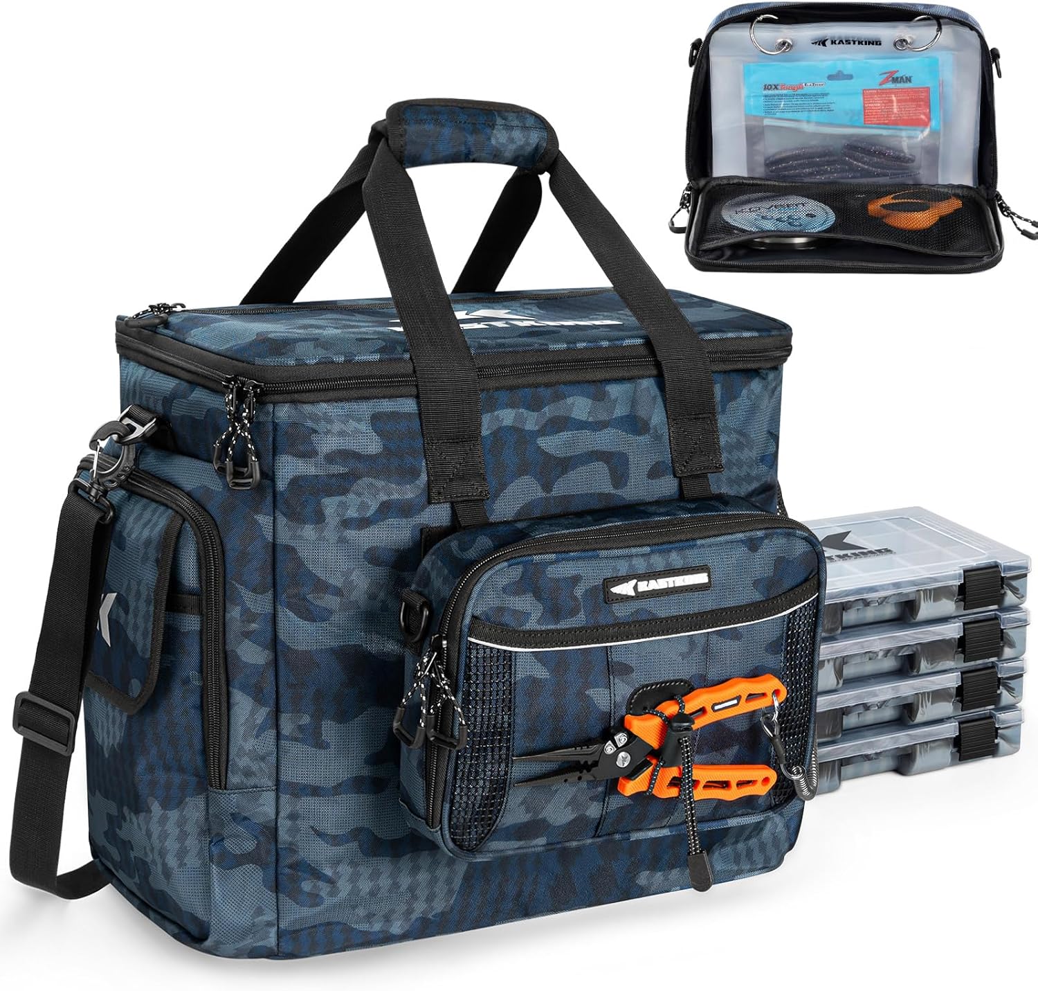 KastKing BaitSpace Fishing Tackle Bag With 4 Tackle Boxes & Removable Bait Binder, Water-Resistant Tackle Storage, Durable Fishing Gear, Adjustable Shoulder Strap
