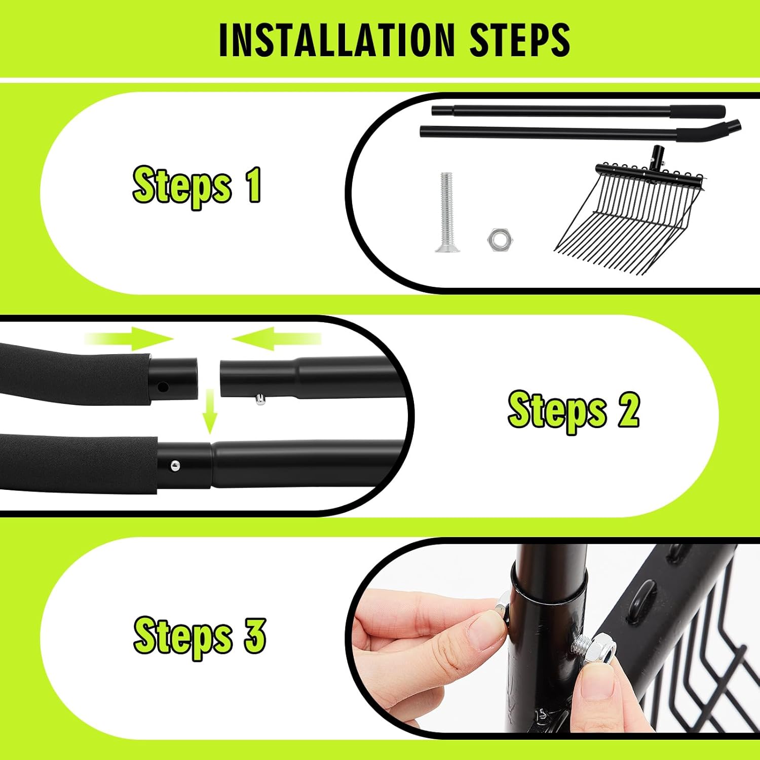 Features: Compared with the straight-axis style, this model achieves a balanced weight distribution, reducing fatigue in the wrists and shoulders during long periods of work. Our hay rake maximizes efficiency and reduces the time and effort required for cleaning the stable. Each package includes two sets of high-quality Horse Poop Rakes, each equipped with a spliced handle for easy assembly and storage. This ensures you always have a backup when needed, providing ultimate convenience for busy barn management Specifications: Material: metal and plastic Size: Head: 14 x 12 inches Handle: 47.24 inches Package includes: 2 X Manure Fork Notes: Manual measurement, please allow slight errors on size. The color may exist a slight difference due to different screen displays
