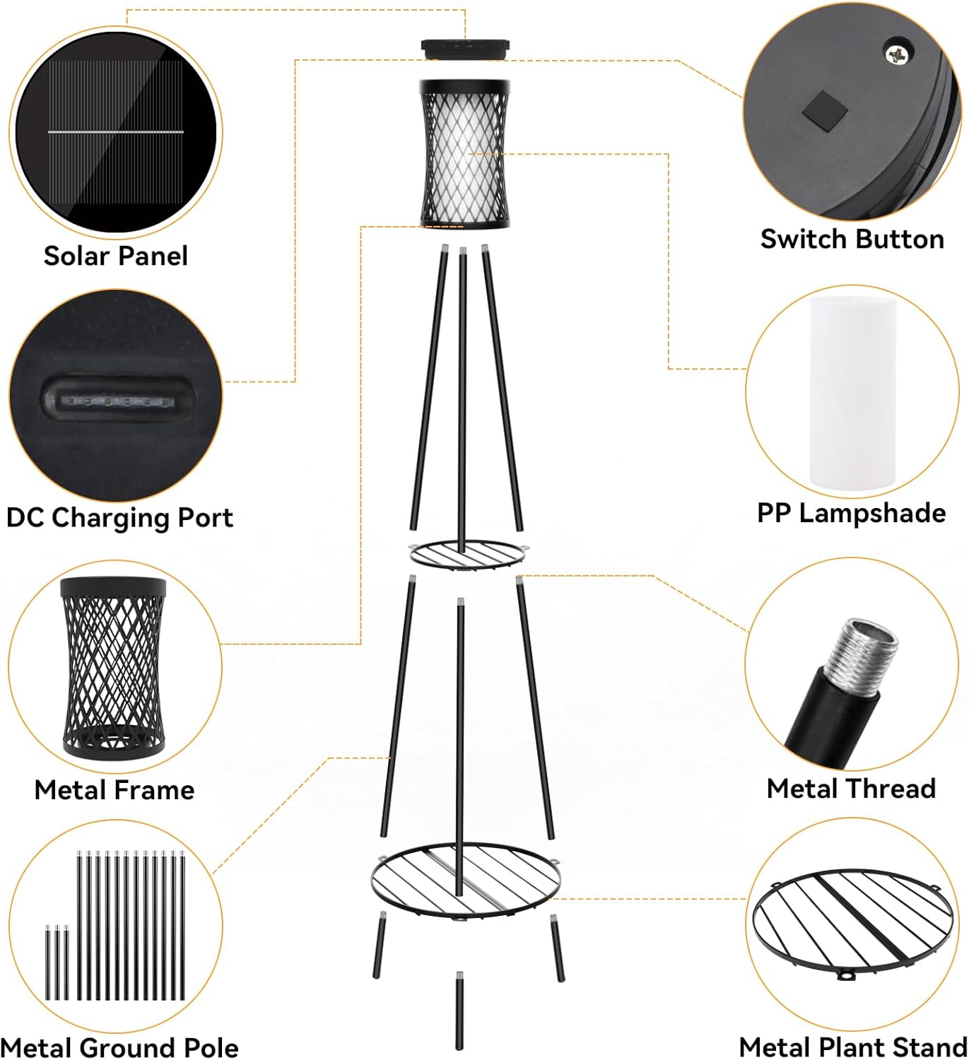 • Add More Possibilities: The 45.67" high outdoor solar floor lamps with two-layer plant stands. You can place the patio floor lamp on either side of your yard. You can place plants or flowers on the larger shelf at the bottom and candles or statues on the shelf above or anything you think of. It creates a cozy ambiance at night and also adds a beautiful touch to your outdoor space.