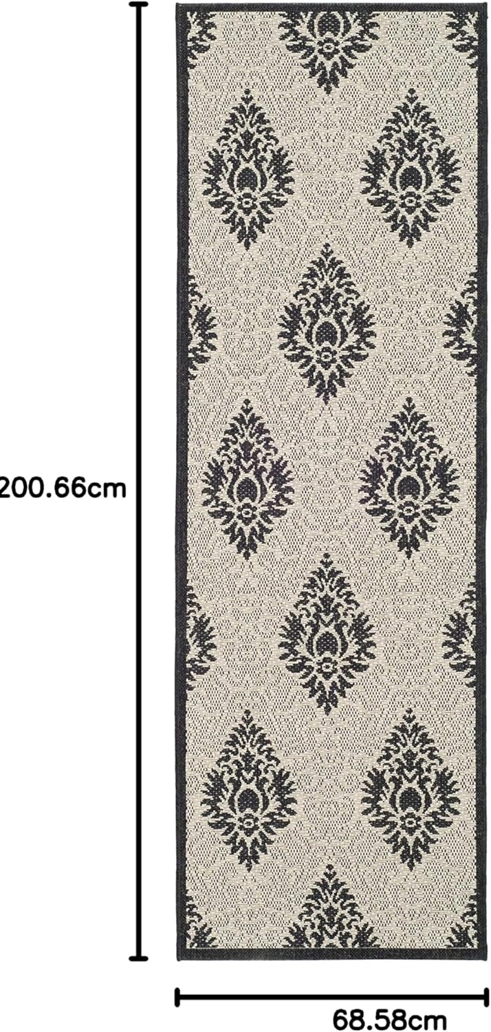 Safavieh's Courtyard Collection is inspired by timeless designs crafted with the softest polypropylene available. This rug is crafted using a power-loomed construction and features a main accent color of black. Perfect for any backyard, patio, deck or poolside, this rug will instantly turn your outdoor area into a resort-style entertaining space. Finely crafted for seasons in the sun and years of open-air gatherings, the Courtyard rug instantly elevates any interior or exterior décor to a space of visual inspiration. More than a decorative enhancement, and easy carefree maintenance. With its style, practicality, and transitional decorating options, this rug extends an open invitation to gather and may just spark impromptu parties. Primary Color: BlackPile Height: 0.25 inches Material: Polypropylene Style: Contemporary Construction: Power-loomed Rug Type: Indoor/Outdoor Feature: Latex Free Rug Dimensions: 2'3" x 10'