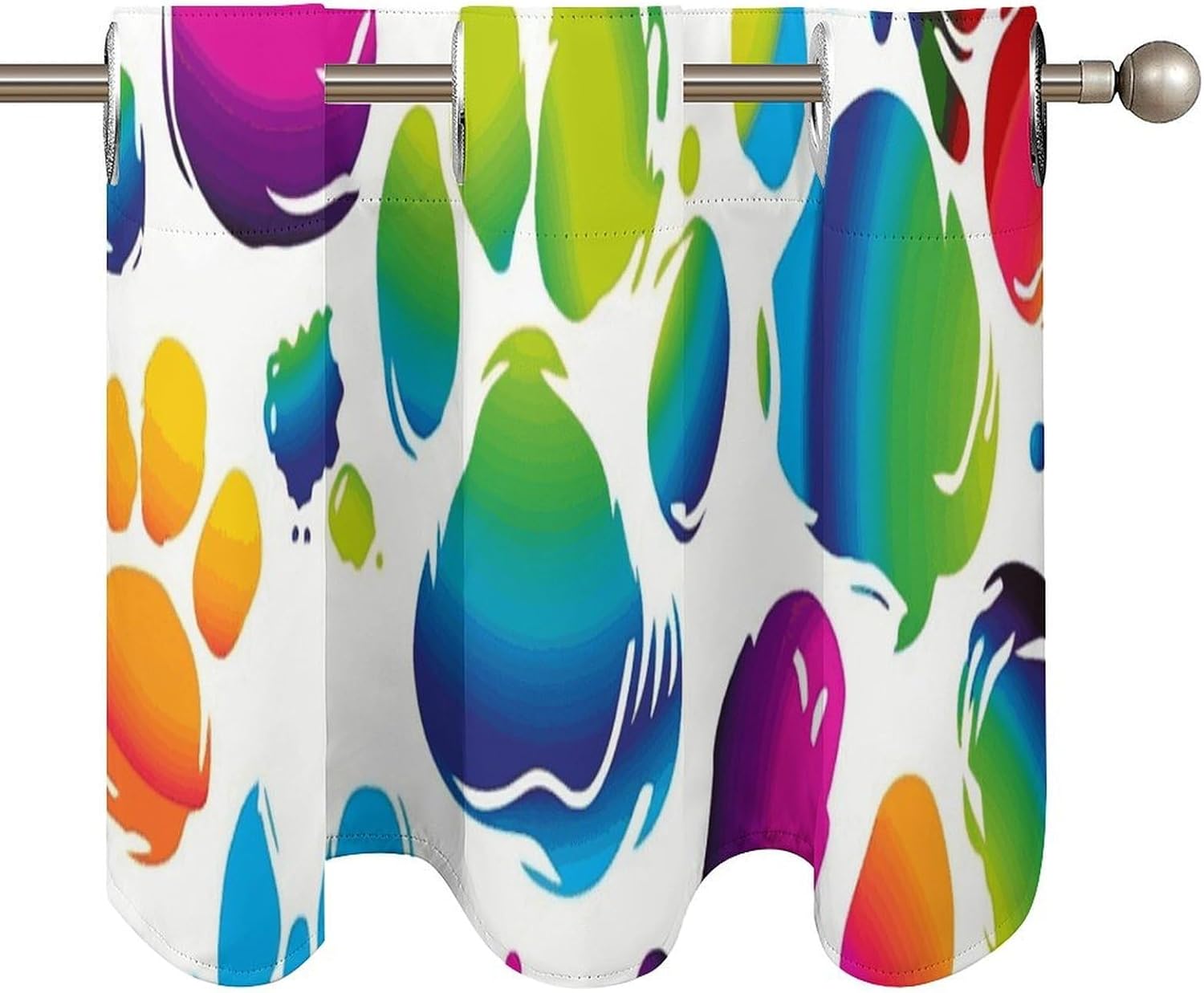 Upgrade Your Space with Premium Blackout CurtainsTransform your home with our versatile 2-panel blackout curtain set. Designed for both style and function, these curtains provide insulation and sun protection while enhancing your interior decor.Premium FabricHigh-quality soft texture fabric, using professional printing technology and sewing conditions, soft and comfortable hand feeling. A variety of exquisite patterns to choose from, can easily match a variety of home decoration styles.Exceptional Light BlockingSay goodbye to glare and unwanted sunlight! Our curtains feature tightly woven fabric that effectively darkens your room, making them ideal for shift workers, or movie days. Protect your furniture and floors from UV damage while enjoying a cooler indoor environment.Stylish DesignBlackout valance adds a soft, sophisticated touch to your home. The sophisticated pattern design coordinates beautifully with any existing home decor. The simple pleats on the rod sleeve add an elegant touch.Easy Care & MaintenanceThese Colorful Dog Paw curtain valances are machine washable and quick-drying. Avoid bleaching - simply tumble dry on low for effortless upkeep.Wide CompatibilityWith a 1.8in/4.5cm grommet diameter, the curtains fit most standard rods. Each panel measures 52in W x 18.1in L, each pack contains two pieces.Perfect for Every HomeWhether you're decorating a cozy apartment or a spacious house, these curtains offer:Shade and sun protectionEnergy savingsModern eleganceWish you a happy shopping!