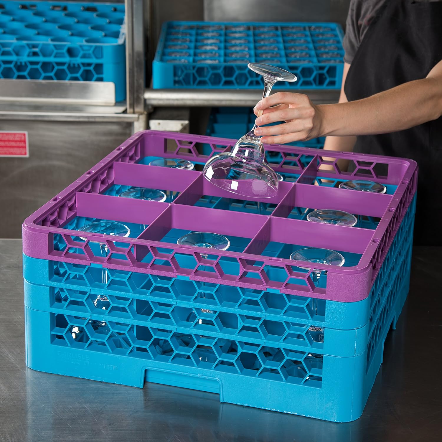 Use with tumblers white wine glasses and other narrow bowl stems; compartment size: 2-15/16" x 2-15/16"; accommodates glasses up to 2-11/16" in diameter.