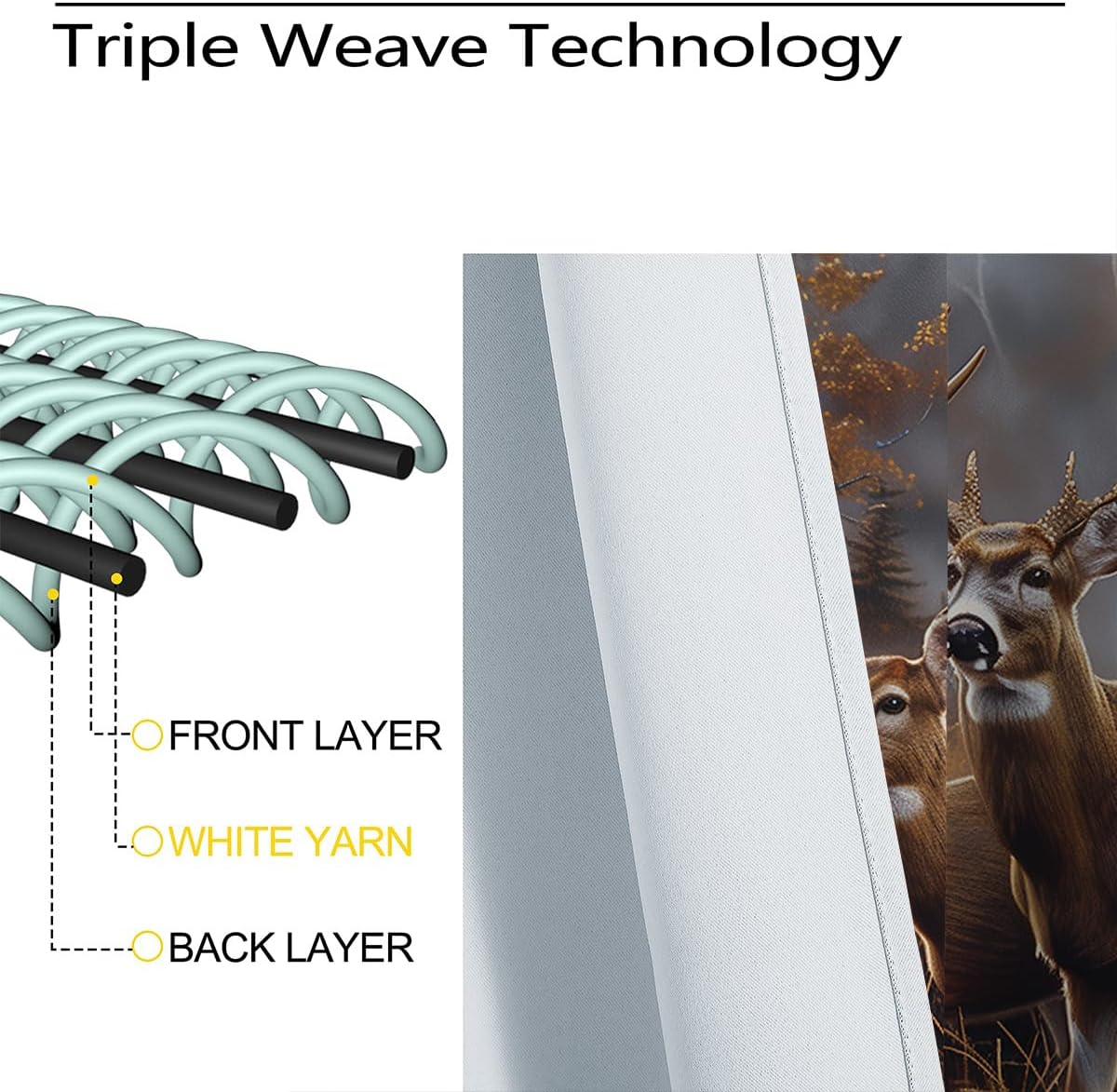 These print curtains are perfect for Living room, bedroom, kids room, kitchen, yard, patio, parlor, sliding door with Deer,Rustic Elk Country Forest Woodland Wildlife pattern.- Unique design:· Save energy costs by insulating against heat and cold.· Reduce noises from busy streets and high-traffic areas.· Protect furniture from sun damage and fading.· Provides complete privacy when needed· Perfect for any bedroom, office kids room and living room.- Package Included:· Blackout window curtains 2 Pcs set ( two panels).- Material:· Our Blackout Curtain Liners are crafted from a durable soft and thick triple weaved blackout fabric which can block out sunlight and UV rays. The darker color of the fabric, the more light it can block.- Easy Care Instructions:· Machine washable in cold water· Do not bleach.· tumble dry on low· low temperature ironing- Notes:· For your curtains to be more perfect, please choose a size 5-10 Inch larger than the actual window width.· here may be slight differences in colors on different displays. If you have any questions about the product, please feel free to contact us.