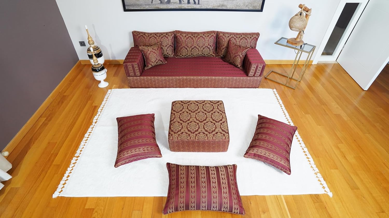 You will receive products in the variant you selected from the listing page. This sofa set comes in 12 separate pieces. If you choose 'Sofa + Ottoman+ Pillows’ you will get these: -1 Floor Seating Cushion (190 x 70 x 10 cm / 75 x 27 x 4 inch) -3 Backrest Pillows (70 x 50 / 27 x 20 inch) -3 Pouf Pillows -2 Armrest Pillows (50 x 20 x 20 cm / 20'' x 8'' x 8'') -1 Ottoman Couch (60 x 60 x 20 cm / 24'' x 24'' x 8'') -2 Small Pillows (35 x 35 cm / 14 x 14 inch) * The floor sofas are not freestanding, they need to lean against a wall or something hard behind * We can customize this product upon your request * All covers include their foam filling inserts * All covers are zippered * Beautiful texture and soft to touch * Comfortable to sit or sleep on * Top-quality finish and workmanship * Excellent for homes, offices, hotels, cafeterias, etc. * Machine washable
