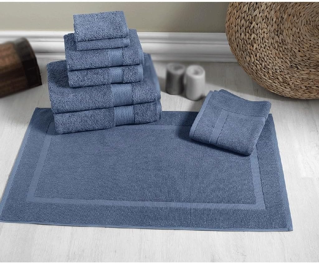 The towel set is made of cotton and provides a hotel-like home away from home feeling.Towels dry quicklyStay thick and for long term use.Machine wash in warm or cold water.Always clean first to improve absorbency and softness.2 bath towels (30x54 )2 square towels (16x27 )2 towels (12x12 )2 bath matsSet includes: 1 Towel settake careDue to manual measurement, the size information may vary by 1-3 centimeters.Due to lighting photography, there may be color differences between the image and the actual object. Based on the real product!The wiring should be smooth, uniform, and firmly fixed.No cotton knots, soft to the touch.