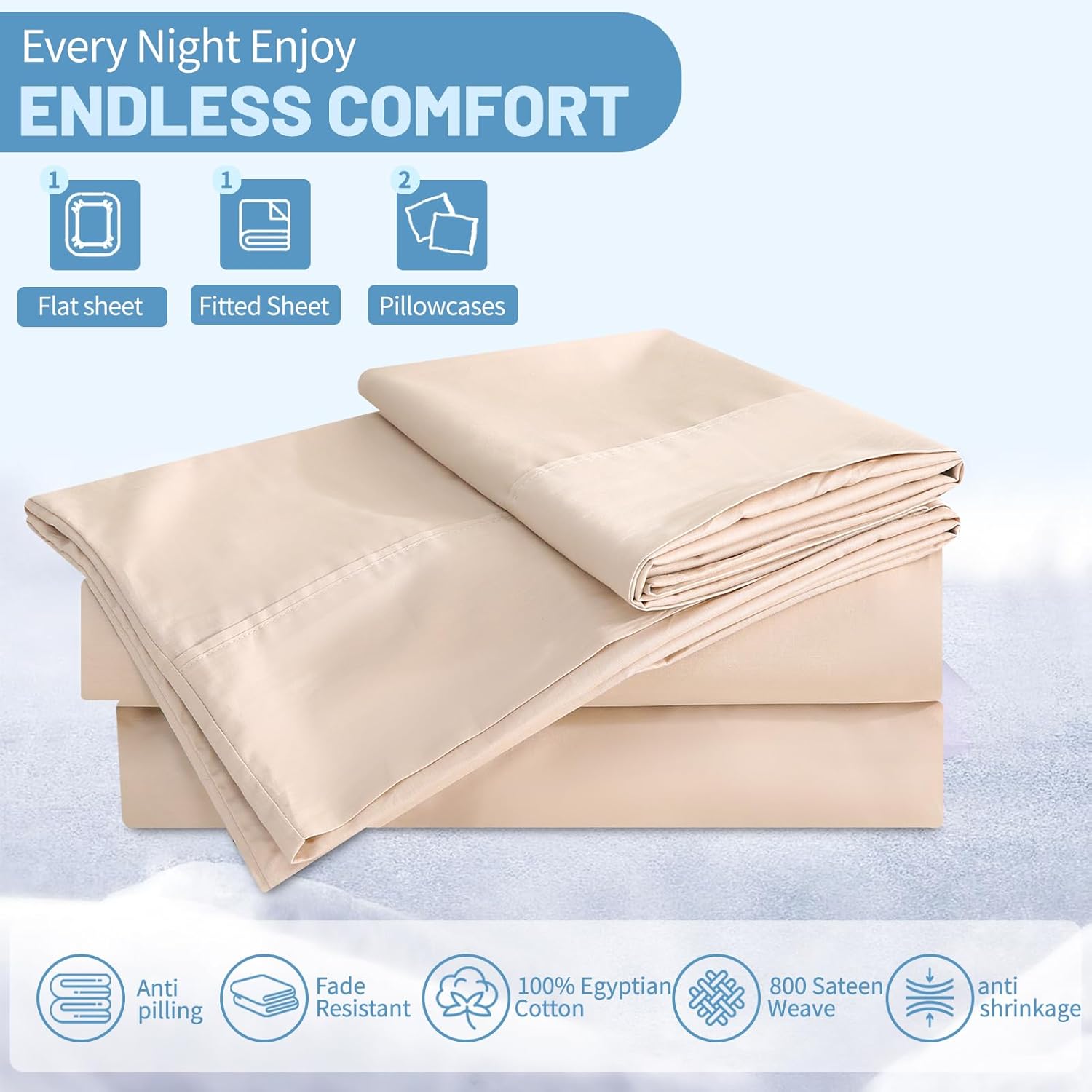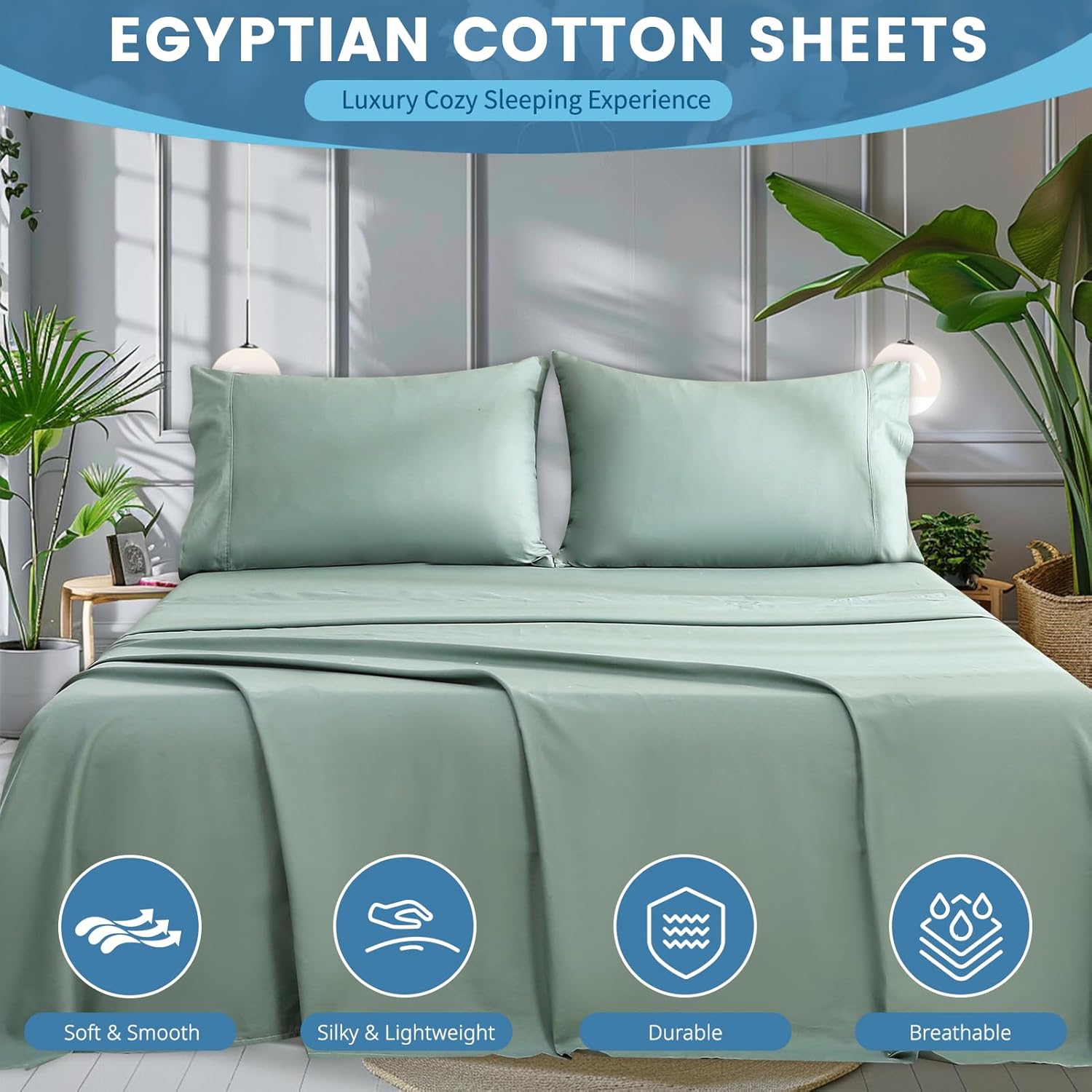 • EXTRA DEEP POCKET KING SHEETS:Our king size bed sheets have very large and extra deep pockets.They fit any mattress with pockets that are 18, 20, 21, 22 and 24 inches deep.100%Egyptian Cotton 4 Piece king Sheet Set is a perfect fit for memory foam toppers, mattress pads, and pillow tops.There's stretchable elastic around the extra deep fitted sheet which stretches for a nice tug around your mattress. You can rest assured that these oversized sheets will stay tight and stay in place
