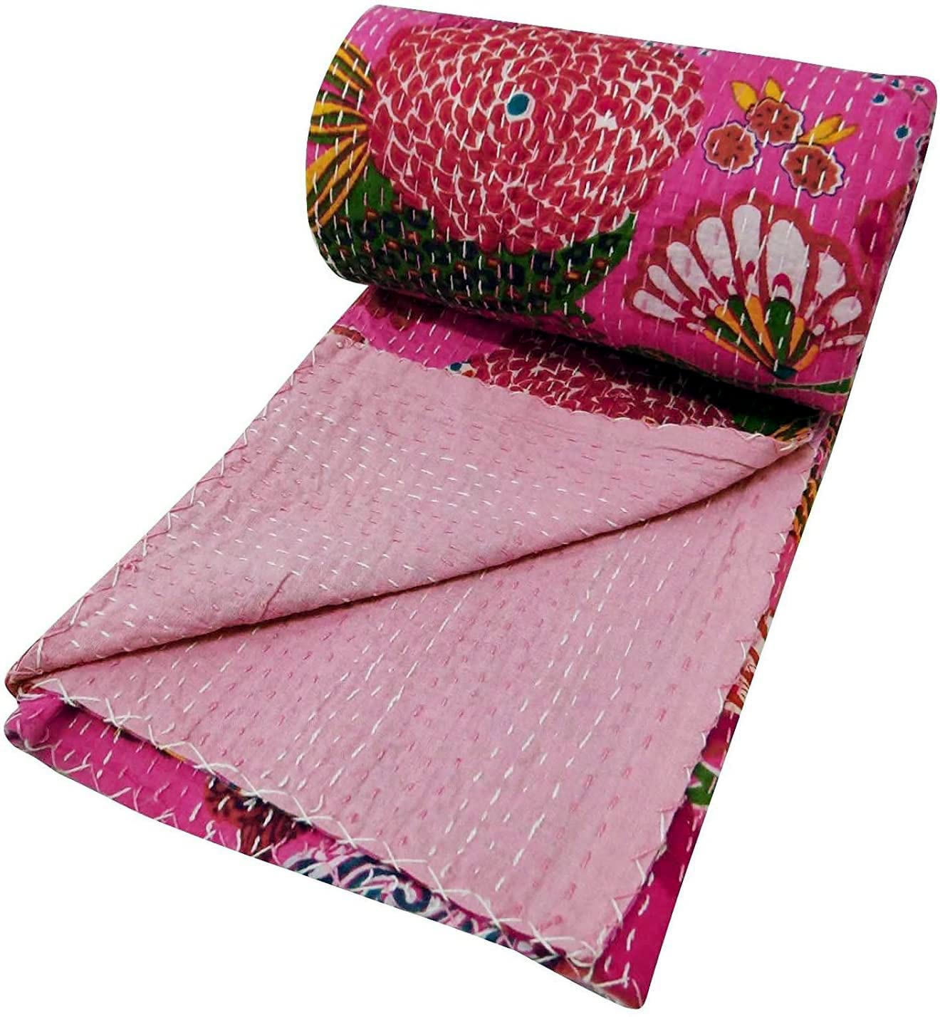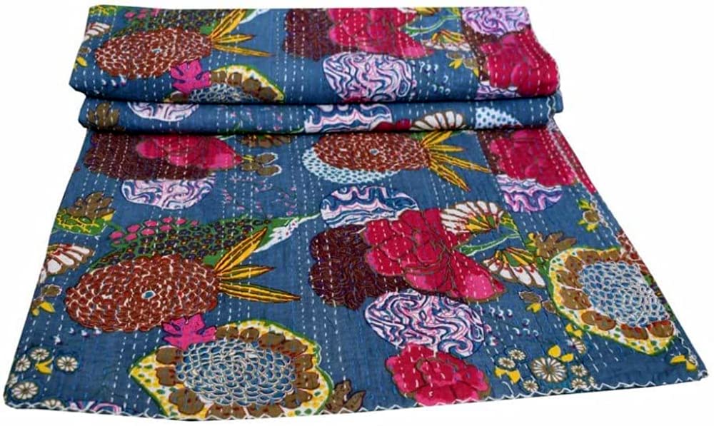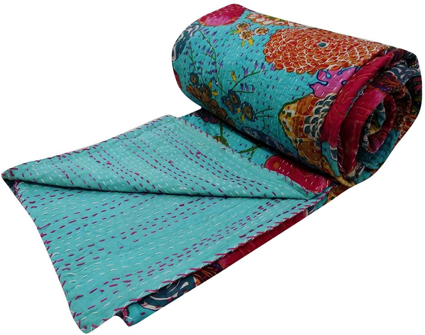 Made with 100% cotton and natural vegetable colors. This piece is of art is completely hand stitched by Women artisan in Rajasthan, India. A beautiful creation to give your home a traditional yet authentic colorful look with this beautiful kantha quilt blanket or throw which can also be used as handmade Kantha bedspread bedding. This piece is of art is completely hand stitched by Women artisan in Rajasthan, India. The entire quilt is hand embroidered with end number of straight running stitches to create a unique product, one of it's kind.These quilts are famed and admired due to their Kantha work. They have different beautiful warm and charming colors, designs and patterns on either side which gives a distinct look. These cotton lightweight "Quilts" can be used as Bedspread , Bedding Throw , Blanket Or Quilt, A Summer Bed Cover, A Fabulous Picnic Rug, Nice Bedroom Quilt This can fit to a King size bed as blanket or throw or can easily fit as bedspread / bed cover to King bed . Washing Instruction – Easy To Hand Wash & Dry Clean.
