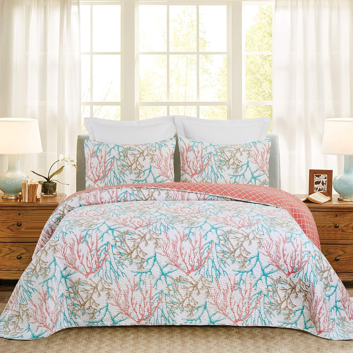 Fall asleep in your personal coastal paradise night after night with Oceanaire Seafoam. With a captivating branching coral design in a sea glass and coral colorway, this quilted king bedspread will complete your relaxing beach house look. Oceanaire Seafoam reverses to a lattice pattern in vibrant coral to create additional styling options for your summer vacation home, your beach cottage, or your everyday coastal style.