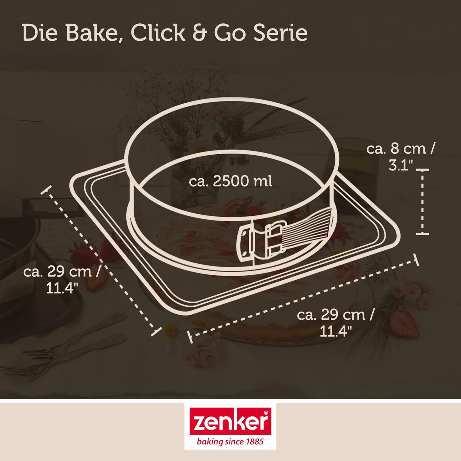 9 cake tray. Measuring 29 x 29 x 7 cm, the mould is the perfect size for classic tarts with extra high rim. The non-stick coating and heat resistance of 230 °C ensure that your cakes are safe and do not break after baking. The practical, separately available hood is equipped with a comfortable soft grip and two practical magnetic signs. So you can put your cake baking mould to the party buffet without bad premonition, because confusion is almost impossible thanks to the matching name plate. Practically, the cover also fits other baking moulds in the series. Bake, Click & Go The highlight of our Bake, Click & Go series is the hood, which can be placed on the baking mould immediately after a short cooling time. So you do not necessarily have to fall the cake before transport or be cumbersome removed from the mould for serving. With our Bake, Click & Go series, you can take the cake directly from the oven to the next party after a short cooling time. In addition to classic springform pans, the product range is also studded with baking trays or original tart trays on which the same cover can be placed.