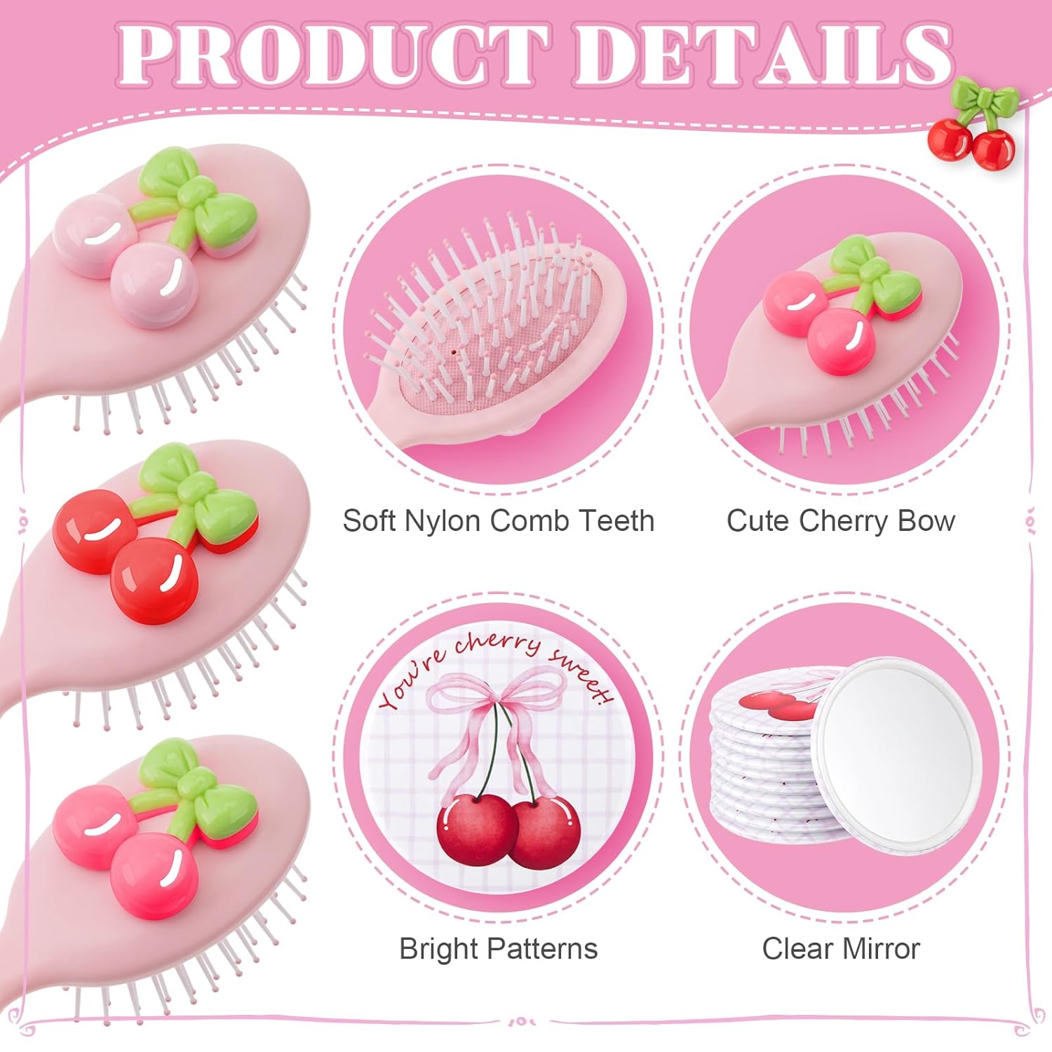 Features: Embrace your love for pink with this delightful set featuring a pink cherry compact mirror and a pink cherry hair brush. The charming combination of these accessories is perfect for those who appreciate a touch of elegance in their daily essentials. The compact mirror is crafted from tinplate, glass, and plastic, while the hair brush is made of durable plastic, ensuring both style and functionality. Together, they make an excellent choice for adding a feminine to your personal grooming routine. Crafted with the utmost attention to detail, the pink cherry compact mirror and hairbrush set is built using high-quality materials—tinplate, glass, and plastic for the mirror, and durable plastic for the brush. This ensures long-lasting use without compromising on aesthetics or functionality. Trust in these durable items to meet your grooming needs, no matter where life takes you. Specifications: Material: Pink cherry mirrors: tinplate, glass, plastic Pink cherry hairbrushes: plastic Color: pink, white Size: Pink cherry mirrors: approx. 2.75 inches/ 7 cm Pink cherry hairbrushes: approx. 5.35 x 2.24 inches/ 13.6 x 5.7 cm Package includes: 24 x Pink cherry mirrors 24 x Pink cherry hair brushes 24 x Organza bags Notes: Manual measurement, please allow slight errors on size. The color may exist a slight difference due to different screen displays