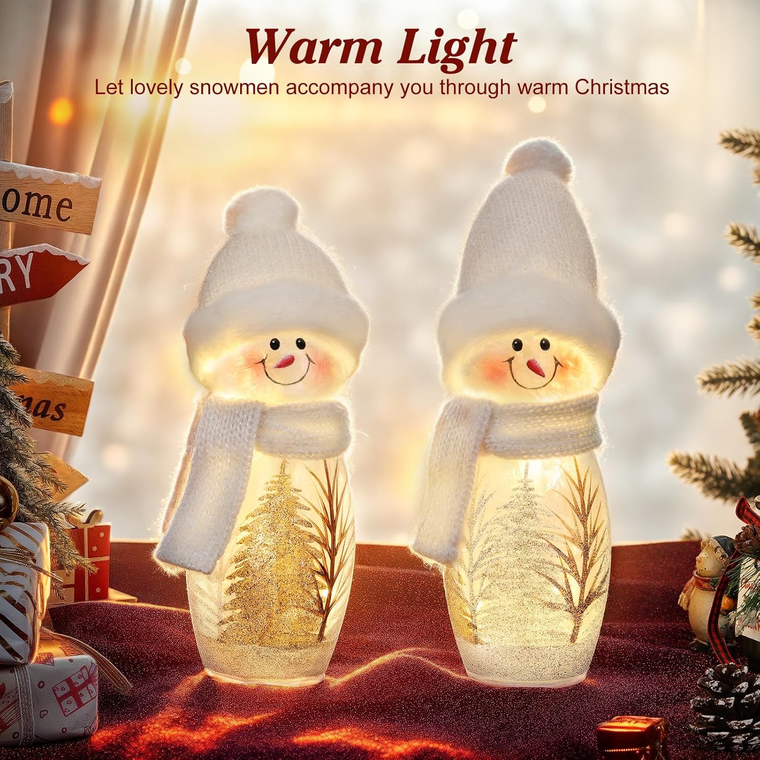 Lewondr Christmas Centerpieces for Tables-Lovely SnowmenMerry Christmas! Lewondr is dedicated to adding beauty to your Christmas home decor. Come and shop for your favorite Christmas table decorations!These Christmas glass snowmen feature an adorable and lifelike design. Adorned with carrots on their noses and wearing scarves and hats, they look just like real snowmen. When the warm light is turned on, the soft glow is like a cozy winter glow. High-quality glass material ensures that the snowman is not easy to deform and fade. Powered by 2×AA batteries (not included), they can be placed on a table, windowsill as decoration, or used as a nightlight, bringing you a cozy using experience.SpecificationSize: 3.94×3.94×6.5 in/ 10×10×16.5 cmPackage List: 2×Lighted Christmas Glass Snowmen