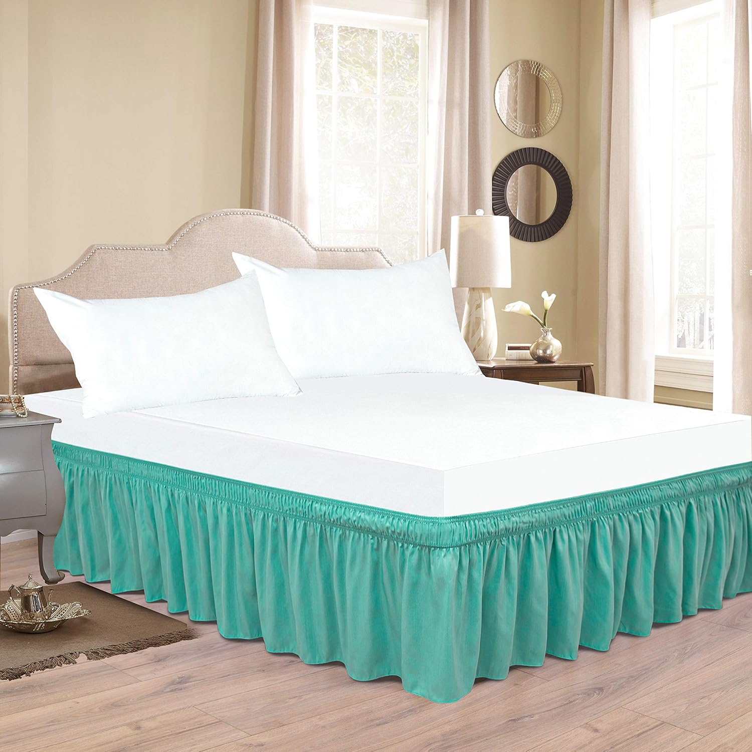 Product DescriptionThese Bed Skirt Three Sides Fabric Elastic Wrap Around Dust Ruffle, Wrinkle Free 800 Thread Count 100% Cotton Hotel Quality Bedskirt.A Generous 12-Inch Drop Length: The dust ruffle/bed skirt has a generous drop of 12-inches length, reaches the floor easily and hides any under the bed storage, hides misshapen box springs, bed frames and bedposts, deflects dust and particles that might otherwise collect underneath your bed or simply to give your bed a uniform and sleek look.Easy On/Easy Off: Featuring a platform-free easy wrap around stretch & elastic adjustable construction, you can easily put this bed skirt on and off by yourself without lifting the mattress. This bed skirt fits mattresses.Luxurious Ultra Soft Cotton Fabric: This ruffled bed skirt is beautiFully made from 100 percent cotton 800 thread count fabric softly shirred for a romantic yet tailored look. The fabric is dust and wrinkle free and extremely soft and smooth.
