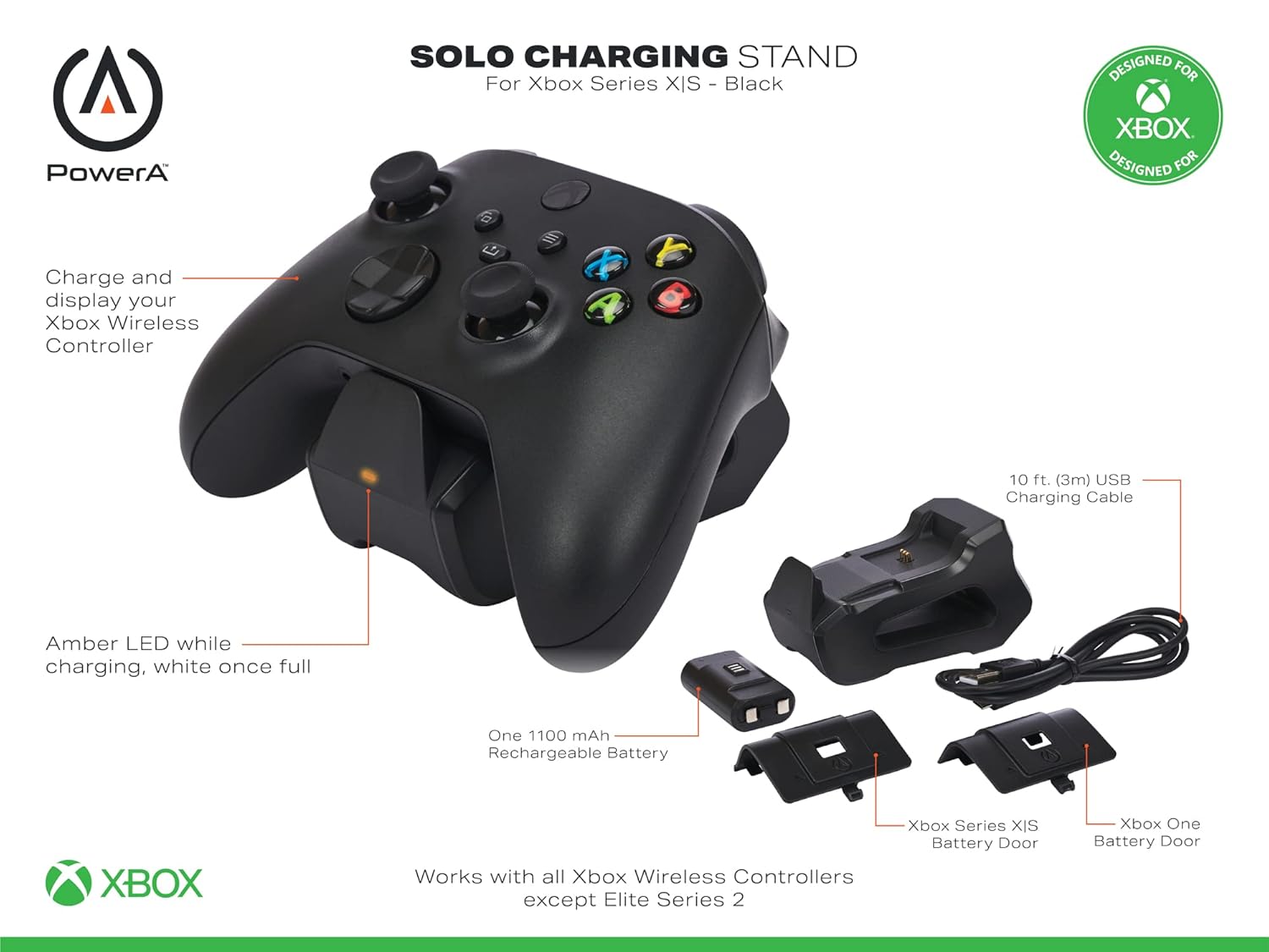 Charge or display your Xbox wireless Controllers with this officially Licensed dual charging station that eliminates the cost of replacement batteries. Included are 4 battery doors (2 for Xbox series x|s/ 2 for Xbox One) plus 2 - 1100mAh rechargeable batteries for up to 40 hours of gameplay. To charge, simply click Controller down on the charging station and monitor for LED color change from amber to white. When fully charged, click up to store. Focus on the game and not on your battery life.