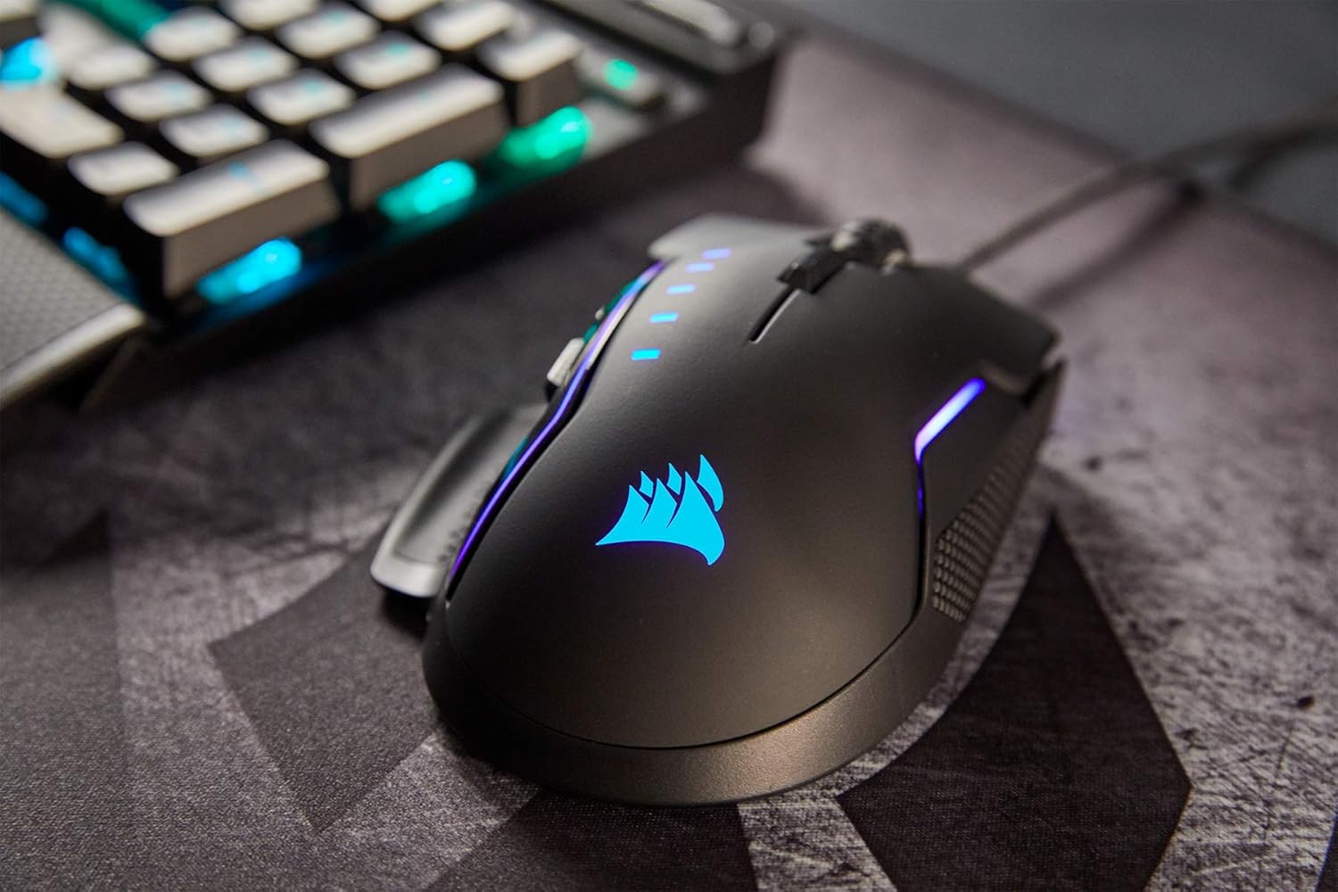 A COMFORTABLE FIT The GLAIVE RGB PRO gaming mouse merges high performance with high comfort, with a contoured shape ideal for extended gaming sessions. Choose between three included interchangeable thumb grips for a perfectly tailored fit. An ultra-accurate native 18,000 DPI optical sensor and high-performance switches rated for more than 50 million clicks ensure that you are always on top of your game. INTELLIGENT CONTROL. UNLIMITED POSSIBILITIES. Vivid dynamic RGB lighting control, sophisticated macro programming and full-system lighting synchronization with compatible CORSAIR peripherals, coolers, fans and more.